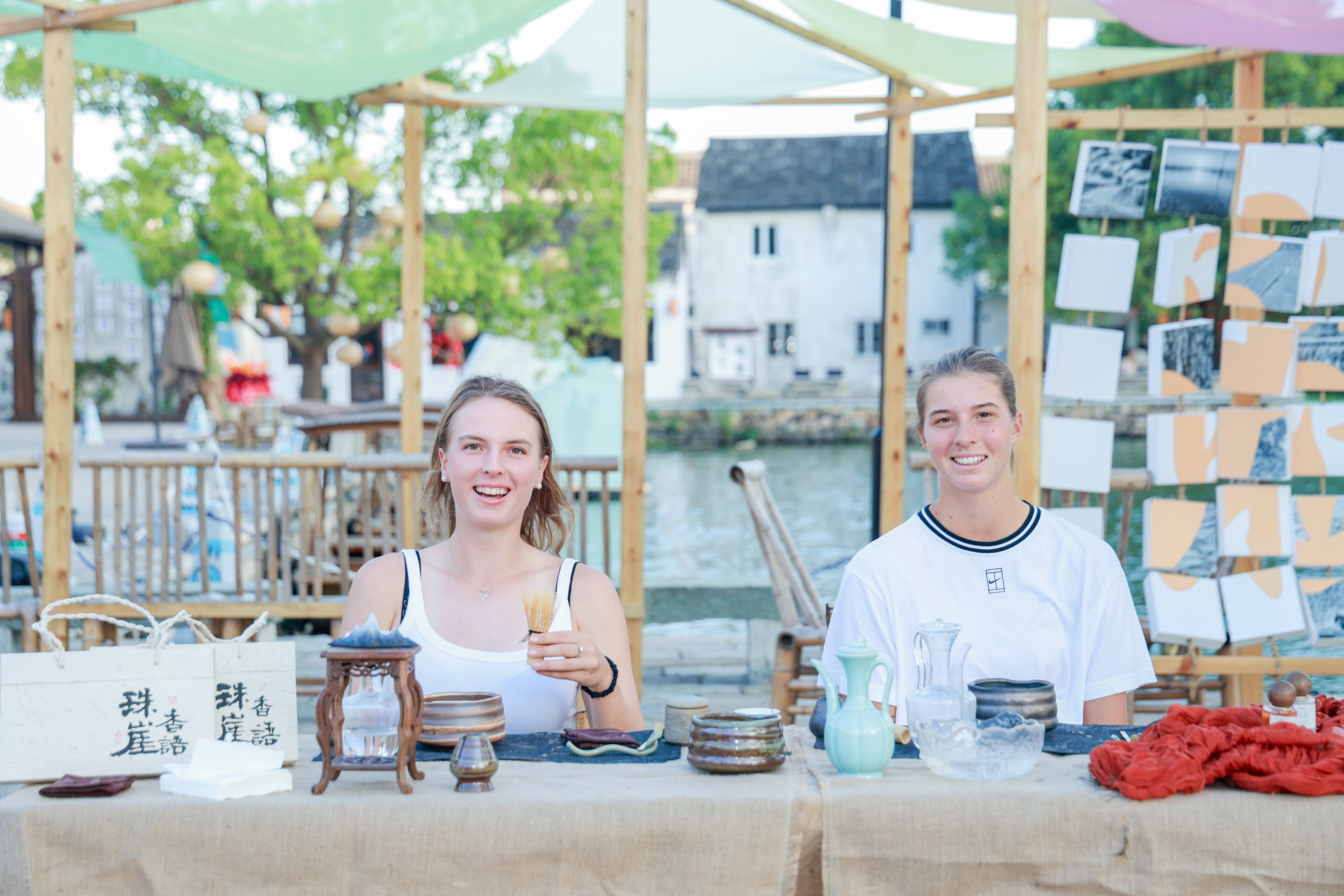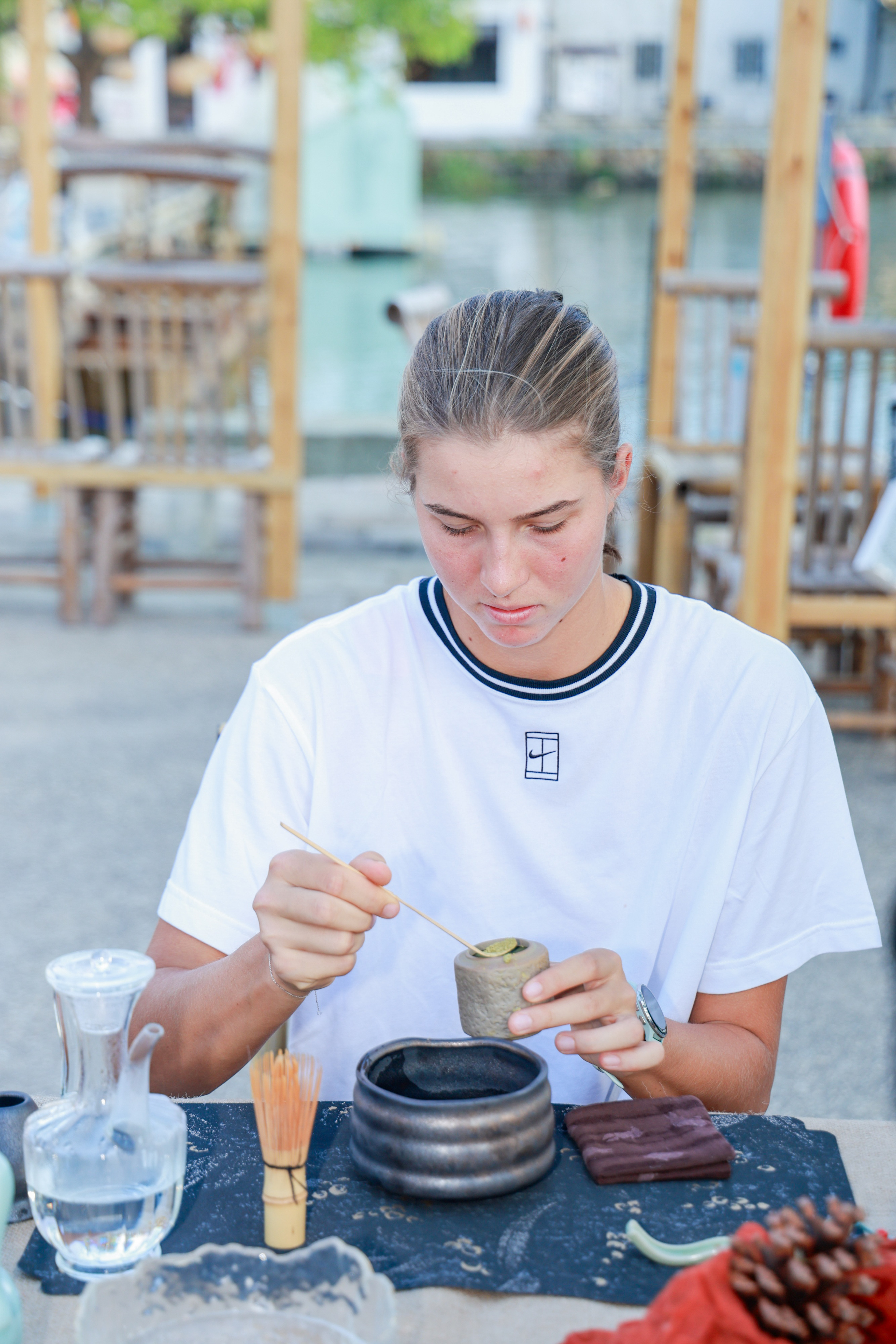 两位参加2025奥克斯·宁波网球公开赛的年轻球星——莉莉·塔格尔与琳达·弗鲁维尔托娃暂别赛场的喧嚣,来到宁波东钱湖的陶麓文化街区,在古村的静谧与优雅之中,开启了一场沉浸式的宋韵文化体验。