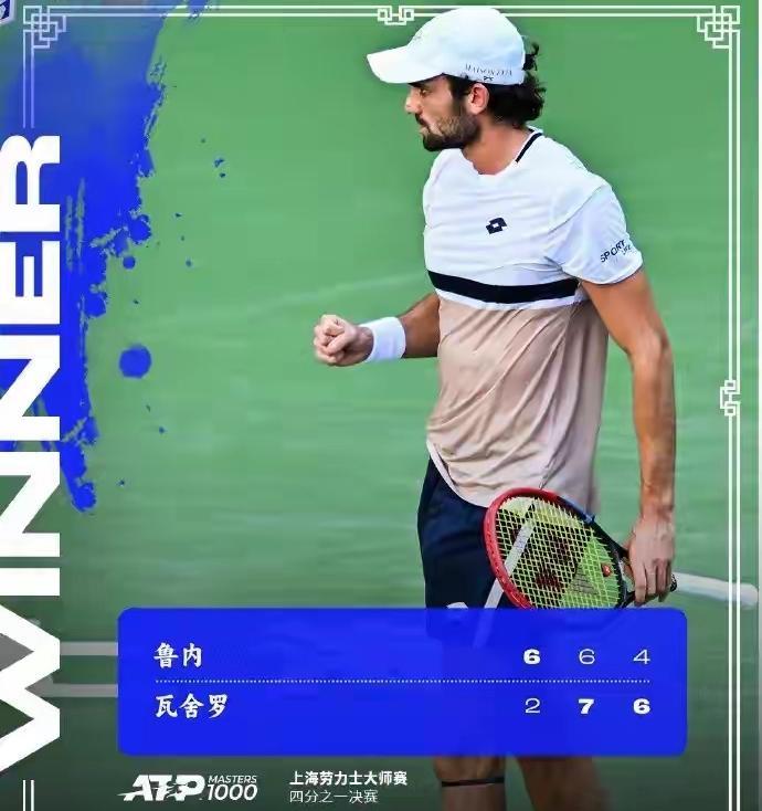 鲁内输了,刚刚结束的一场上海网球大师赛男单1/4决赛,世界排名第9的鲁内与资格赛选手瓦舍罗鏖战近三个小时,最终以6-2、6(4)-7、4-6被逆转,无缘晋级,而10号种子鲁内,而来自小国摩纳哥、世界排名仅204位的瓦舍罗职业生涯首进巡回赛四强,半决赛将面对德约科维奇与贝尔赫斯的胜者。