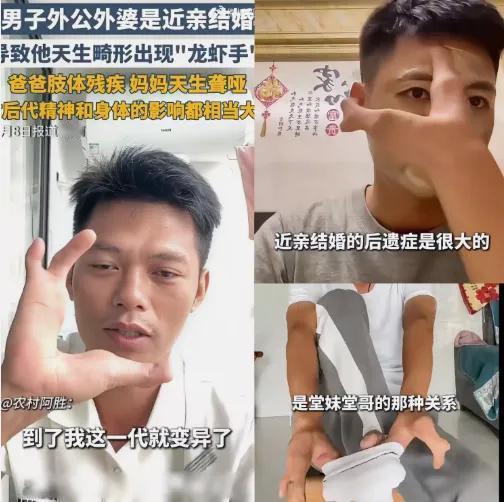 真是疯了都这样了还要结婚生子!湖南一90后男子因外公外婆近亲结婚,导致家族连续三代出现严重健康问题…… 可这不是电视剧里的苦情戏,是压在他身上二十多年的真实重量 2025年10月8日,他坐在老家堂屋的门槛上,把双手举到镜头前——指节粘成硬邦邦的团,掌骨像被踩扁的塑料瓶,医生管这叫“先天性并指畸形”,邻居背后叫“龙虾手” 母亲蹲在旁边,指尖抚过他的畸形指,喉咙里发出“呜呜”的声音 她天生聋哑,是外公外婆亲堂兄妹结婚的第一个“产物” 父亲拄着拐杖站在门口,裤管是空的——小时候摔断腿没治好,两人都带着隐性致病基因,到他这代,基因里的“炸弹”全炸了 你没见过“龙虾手”的日子有多难 早上穿衣服,袖子卡着手指扯不下来,要妈妈帮忙拽十分钟 吃饭夹菜,筷子像长在手上的树枝,夹起的菜掉在碗里,溅得桌面都是 上学时,同学围在课桌边,伸着手要摸他的手,他把脸埋在课本里,耳朵红得发烫 老师说“要包容”,可包容不了他递作业时,同桌嫌脏的眼神 近亲结婚的风险不是说说而已 医生说,近亲夫妻的隐性致病基因像两个藏在暗处的开关,碰到一起就会“亮红灯” 比如他的妈妈,外公外婆各带一个聋哑基因,她有25%概率发病——刚好中了 到他这代,父母的基因缺陷叠加,概率变成50%,再加上父亲的肢体残疾基因,“龙虾手”就成了逃不掉的噩梦 还有数据说,近亲结婚的流产率比普通夫妻高3倍,死胎率高2倍,就算孩子活下来,得先天性心脏病、智力低下的概率也比别人高10倍 有人说“我堂妹嫁表哥,孩子没缺陷,是天运” 可天运哪是常有的? 就像你买十张彩票中一张,不能说彩票都是必中的 这个湖南小伙的邻居里,有对表兄妹结婚,生的孩子到三岁还不会说话,去医院查是唐氏综合征 孩子妈妈每天抱着他在村口转悠,逢人就说“早知道打死我也不嫁” 中国民法典第1048条写得清楚——禁止直系血亲和三代以内旁系血亲结婚 可有些老人觉得“亲上加亲”是福气,说“以前都是这么过来的” 可以前的人不知道,近亲结婚的孩子,不是“天才”就是“残疾”是谣言 爱因斯坦的父母是远房表亲,不在三代以内,而且他的成就和近亲无关 反而达尔文和表姐结婚,十个孩子三个早夭,三个不育,这才是近亲结婚的真实模样 他说现在最大的愿望,是能像正常人一样握一次手 能帮妈妈梳梳头,能自己系鞋带,能在超市里拿一瓶矿泉水不被人盯着看 妈妈听不到他的话,可每次他举着畸形手叹气,妈妈就会递来一个苹果——她用牙咬开皮,把果肉削成小块,放在他手心里 爸爸说“对不起”,可对不起换不回他的正常手,换不回妈妈的声音 网友评论里有人说“幸好我堂妹赌赢了” 可赌赢的是运气,赌输的是人生 就像这个小伙,他没赌的资格,因为外公外婆的选择,他从出生就站在输家的位置 要我说,近亲结婚不是“亲”,是“坑” 坑的是孩子的健康,坑的是家庭的未来 法律禁止不是要拆姻缘,是要护着每一个还没出生的孩子 就像他说的“如果能选,我宁愿没出生,也不想带着畸形活一辈子” 你身边有相信“亲上加亲”的人吗? 你会怎么跟他们说近亲结婚的风险?