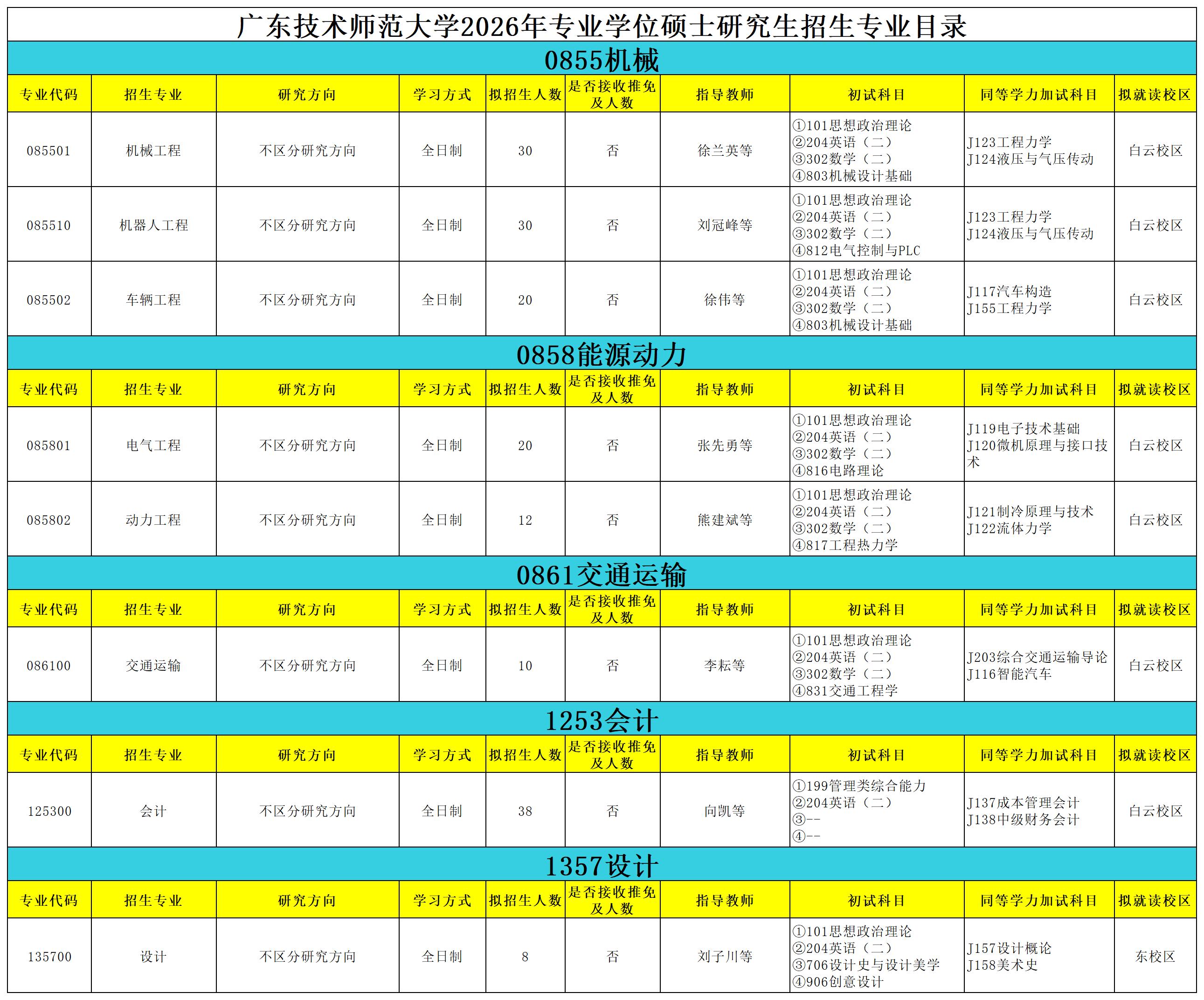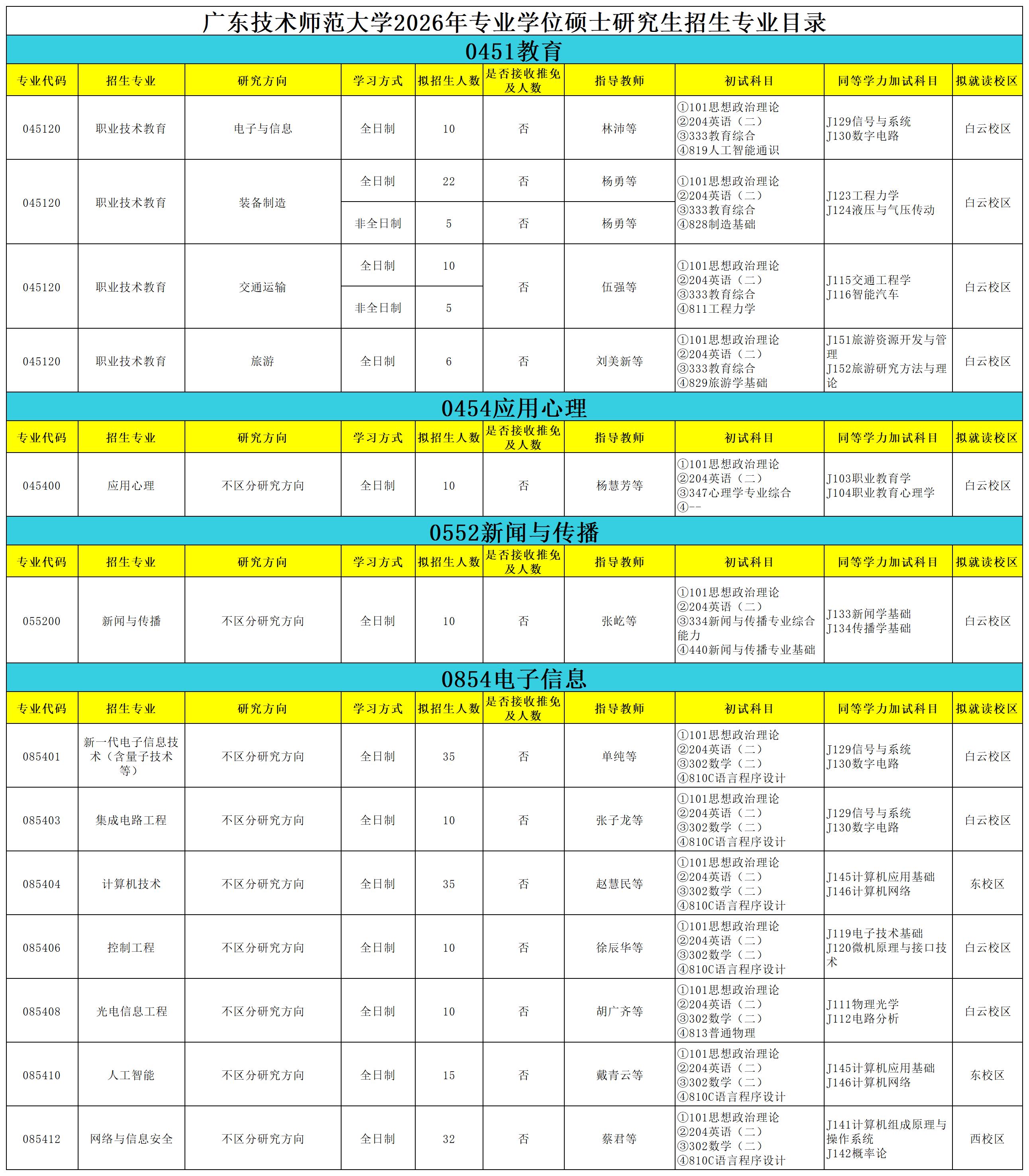 广技师公布26研究生招生专业及招生人数。广东技术师范大学2026年学术型/专业型硕士研究生招生专业目录表公布!学术型硕士招生专业10个,计划招生人数100人;专业型硕士招生专业41个,计划招生人数761人