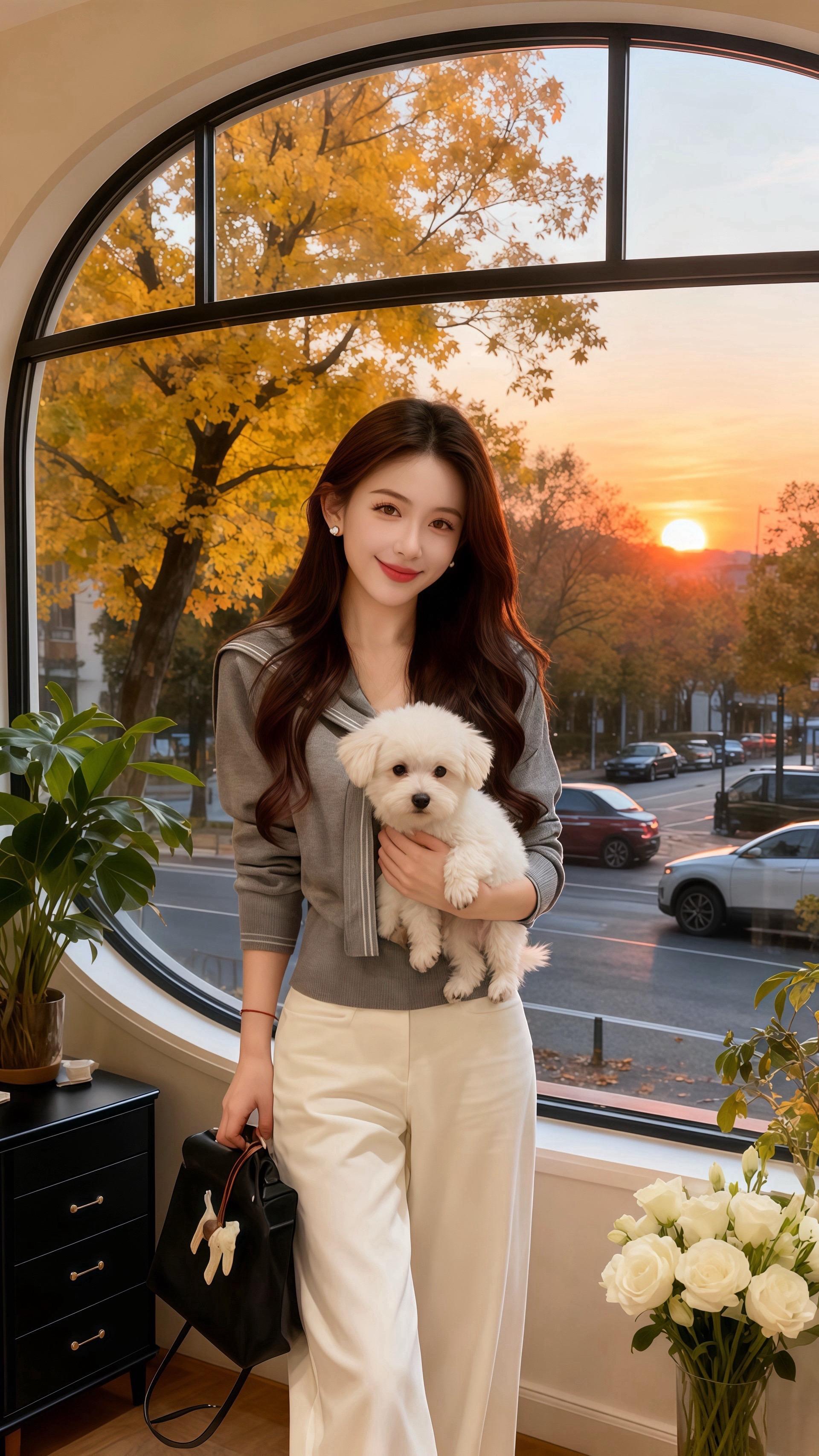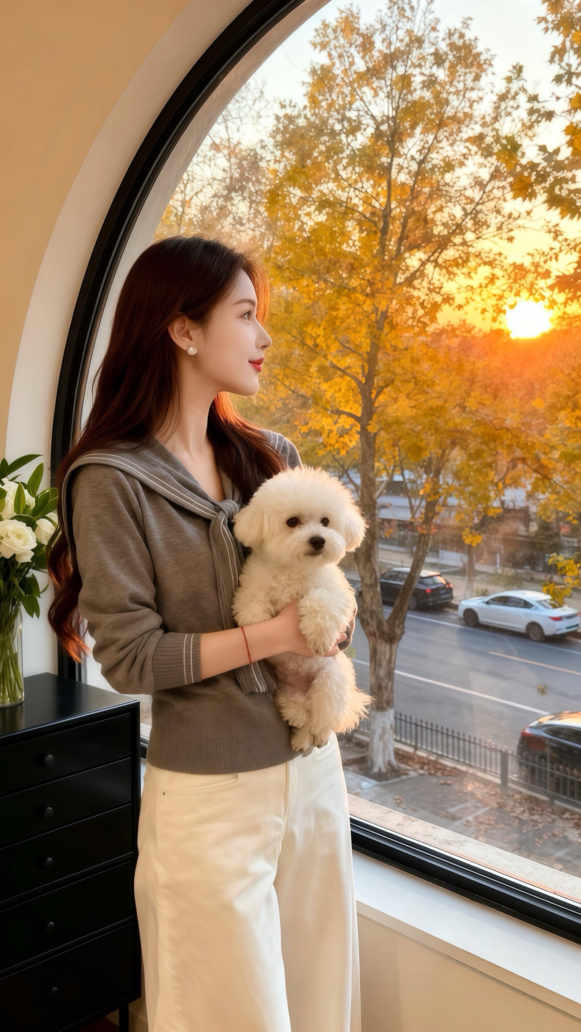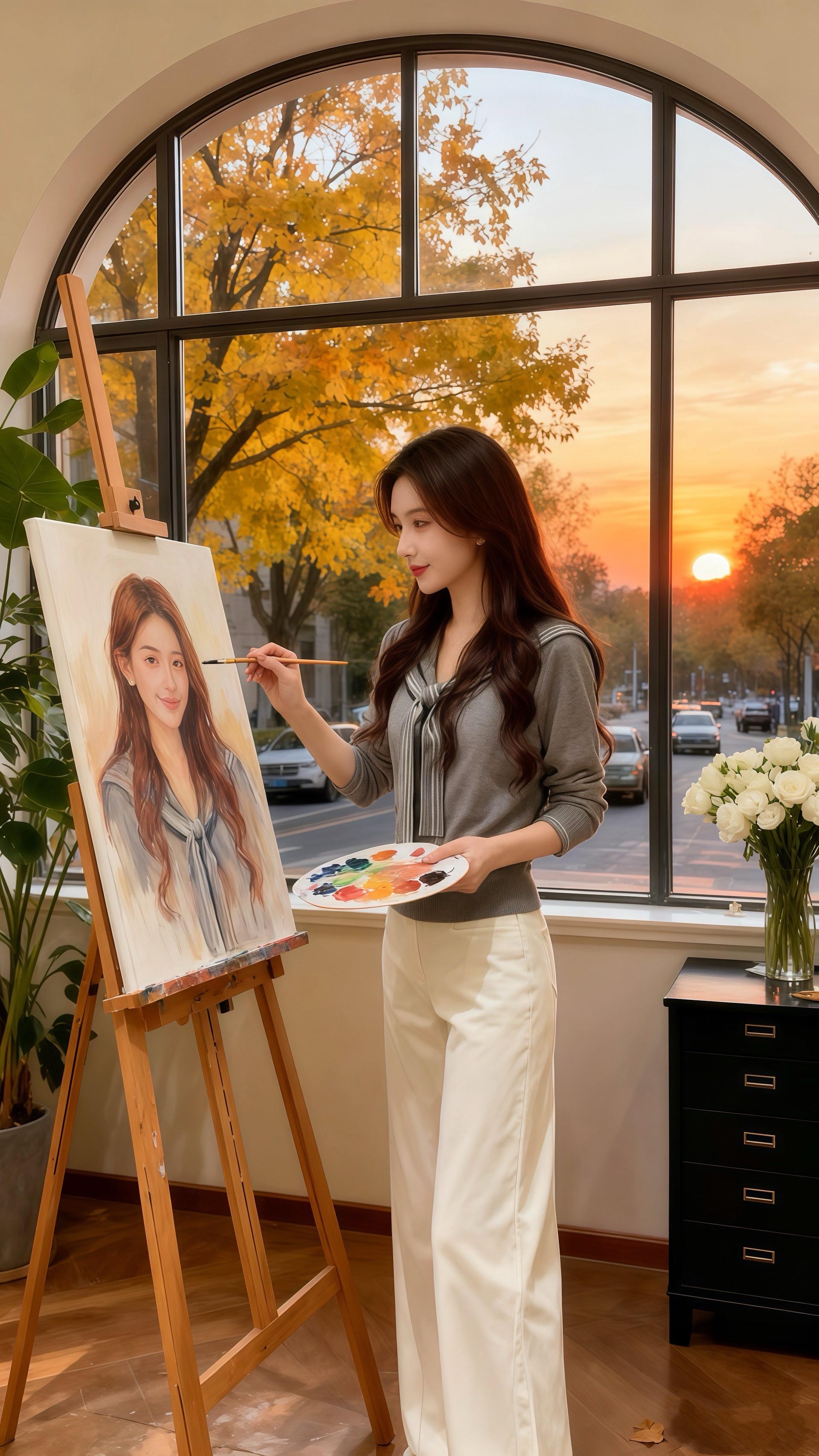 她穿着舒适的穿搭,在满是绿植与白玫瑰的空间里,让画笔随着心意游走。窗外车水马龙,窗内她专注作画,把对生活的热忱、对梦想的执着,都揉进了色彩里。