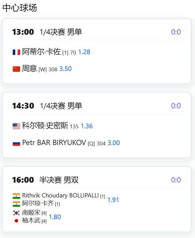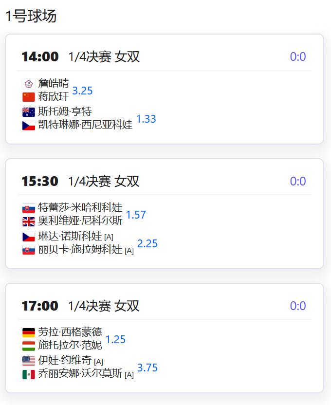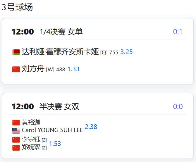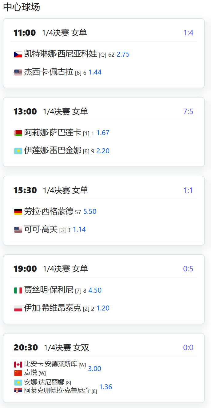 今日赛程: WTA1000赛武汉站,女双四分之一决赛,袁悦/安德莱斯库将在中心球场最后一场对阵8号种子克鲁尼奇/达尼丽娜; 蒋欣圩/詹皓晴将在1号球场第一场对阵前世界第一组合亨特/西尼亚科娃; CH125济南,男单四分之一决赛,小将周意将与头号种子卡佐争夺一个四强席位; W35昆山,女单四分之一决赛,持外卡参赛的刘方舟将对阵资格赛球员霍姆奇安斯卡娅; 尤晓迪将对阵头号种子普罗佐罗娃; 女双半决赛,2号种子郑妩双/李宗钰将对阵黄裕迦/卡罗·杨。