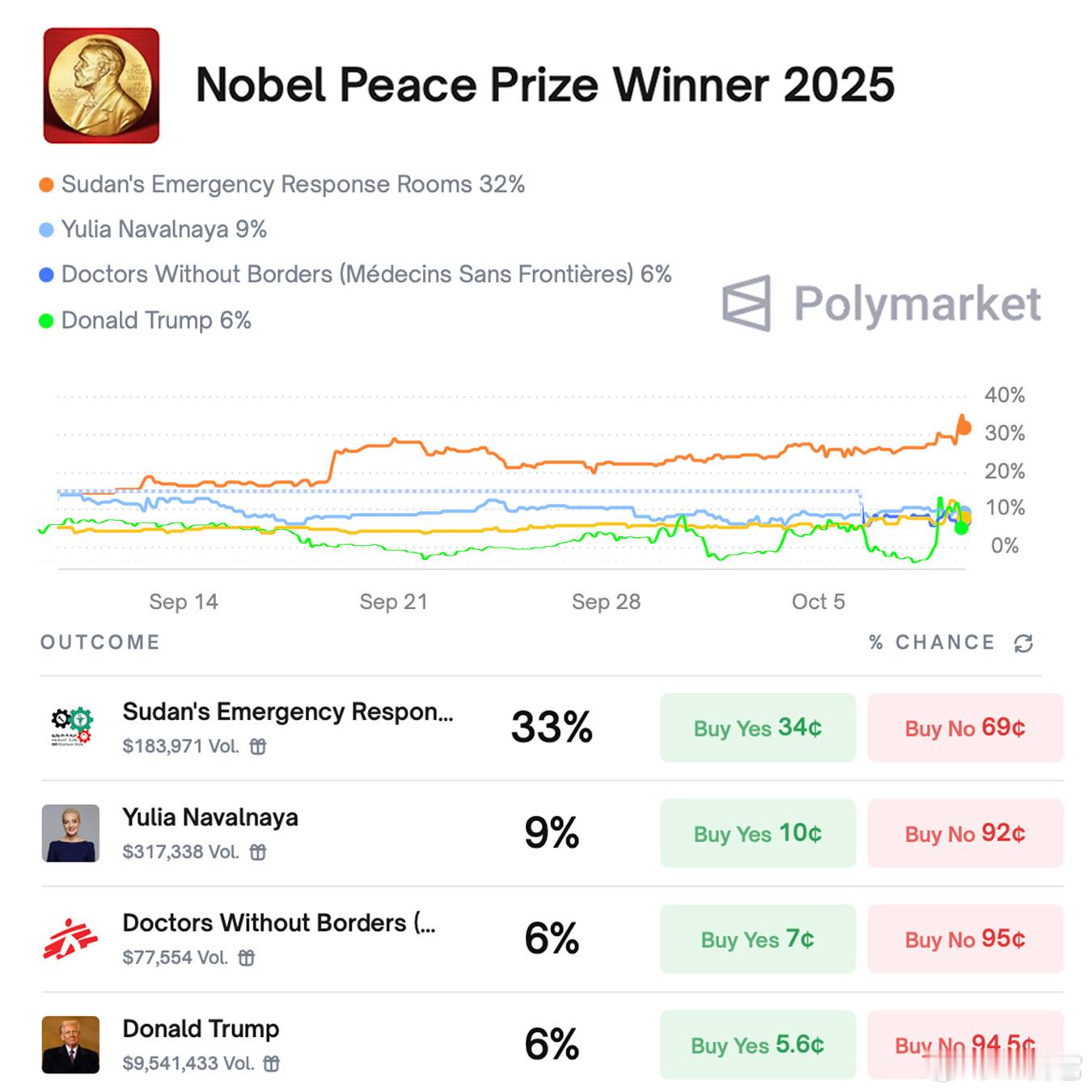 ❗️ 突发新闻:根据的赔率,特朗普预计将在 2025 年诺贝尔和平奖评选中以 6% 的得票率位居第四。
