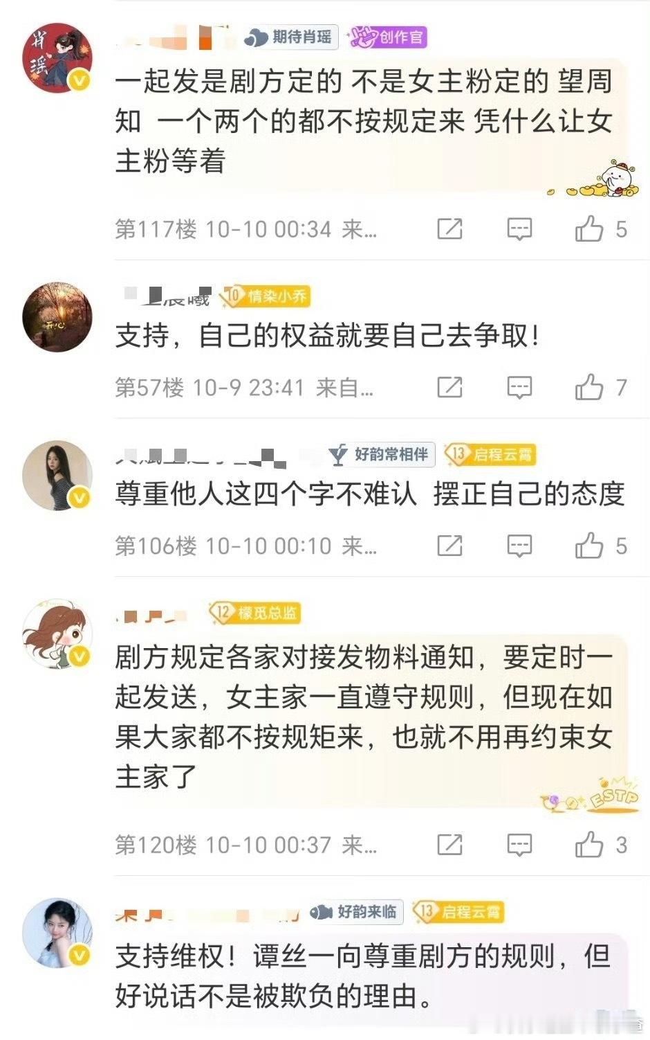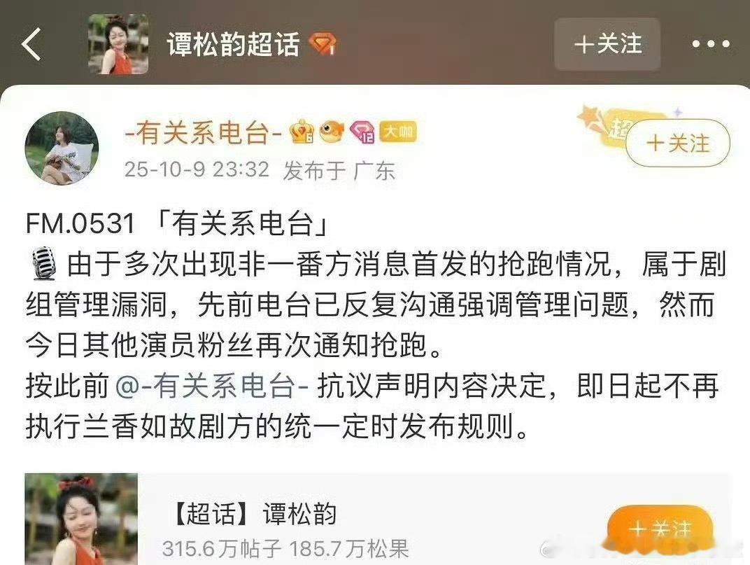 郑合惠子粉丝对接号率先发布剧组次日物料通知(10月10日杀青相关宣传),谭松韵方对接号22:49跟进发布后,公开谴责惠子方“抢跑”,违反“一番演员优先发布”规则,宣布即日起不再配合剧方统一发布流程。