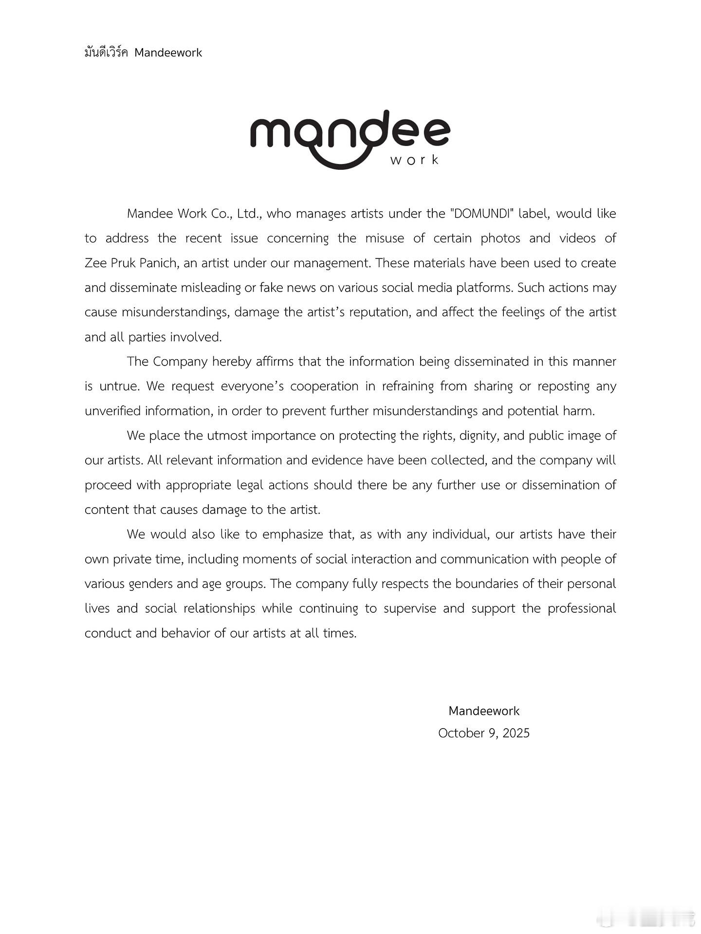 李海海公司声明 泰星李海海否认恋情后,公司发声明,称李海海的某些视频照片被用于在各种社交媒体平台上编造和传播误导性虚假新闻,此类行为会造成误解,损害艺术家的声誉,并影响艺术家及所有相关方的感受。公司特此声明,信息并不属实。泰美了欧