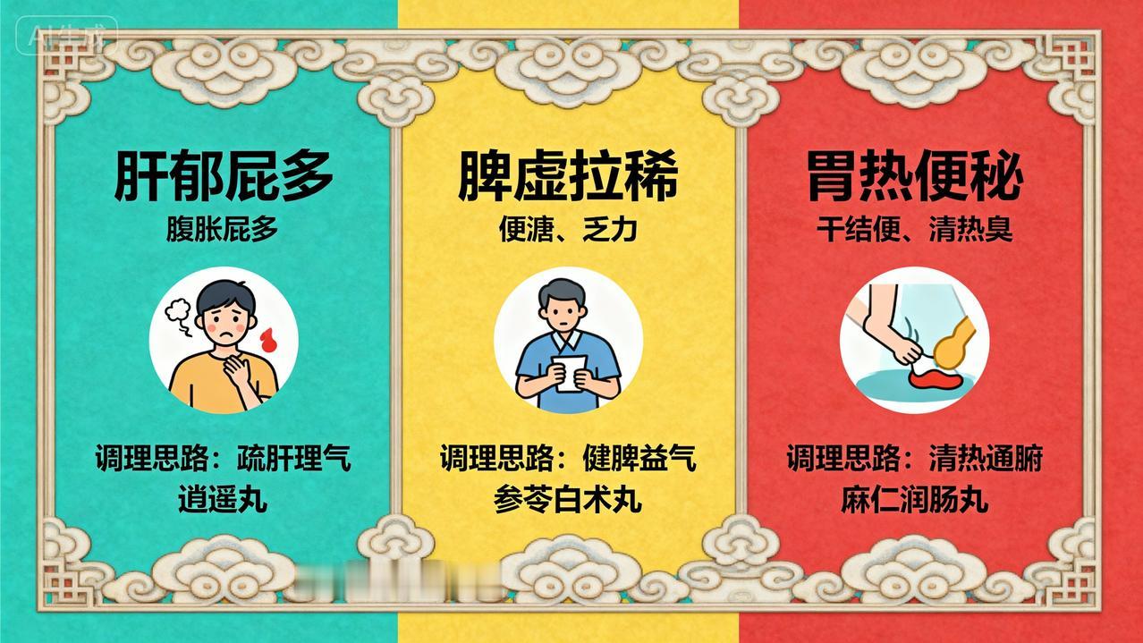 肝郁屁多、脾虚拉稀、胃热便秘?3个中成药对症调理 身体出现“屁多、拉稀、便秘”,多与肝、脾、胃功能失调相关,不同问题对应不同调理思路,选对中成药才能精准改善。 一、肝郁屁多:疏肝解郁是关键 若屁多的同时,还常觉得情绪低落、爱叹气,或生气后屁更频繁,多是肝气郁结、气机不畅,导致肠道内气体增多。 - 调理思路:疏肝解郁,理顺气机 - 参考用药:逍遥丸 - 核心作用:通过柴胡、白芍等成分疏理肝气,缓解情绪郁结;搭配白术、茯苓健脾,避免肝气影响脾胃运化,从根源减少气体生成,改善屁多问题。 二、脾虚拉稀:健脾祛湿是重点 若拉稀频繁,大便稀溏不成形,还伴随吃点凉的就腹泻、浑身没力气、食欲差,多是脾虚无力运化水湿,湿气下注肠道导致。 - 调理思路:健脾胃,行气祛湿 - 参考用药:参苓白术散 - 核心作用:以人参、白术健脾益气,增强脾胃运化能力;茯苓、薏苡仁祛湿,减少肠道内多余湿气;搭配陈皮行气,让脾胃运化更顺畅,缓解拉稀、大便不成形的情况。 三、胃热便秘:清热通便解困扰 若便秘时大便干结难解,还伴有口干口臭、牙龈肿痛、肚子胀且有灼热感,多是胃热旺盛,耗伤肠道津液,导致大便干燥。 - 调理思路:清热通便 - 参考用药:麻仁润肠丸 - 核心作用:用大黄、厚朴等成分清除胃热,缓解内热症状;搭配麻仁、杏仁润肠通便,补充肠道津液,让干结的大便更容易排出,同时减轻口干、口臭等不适。