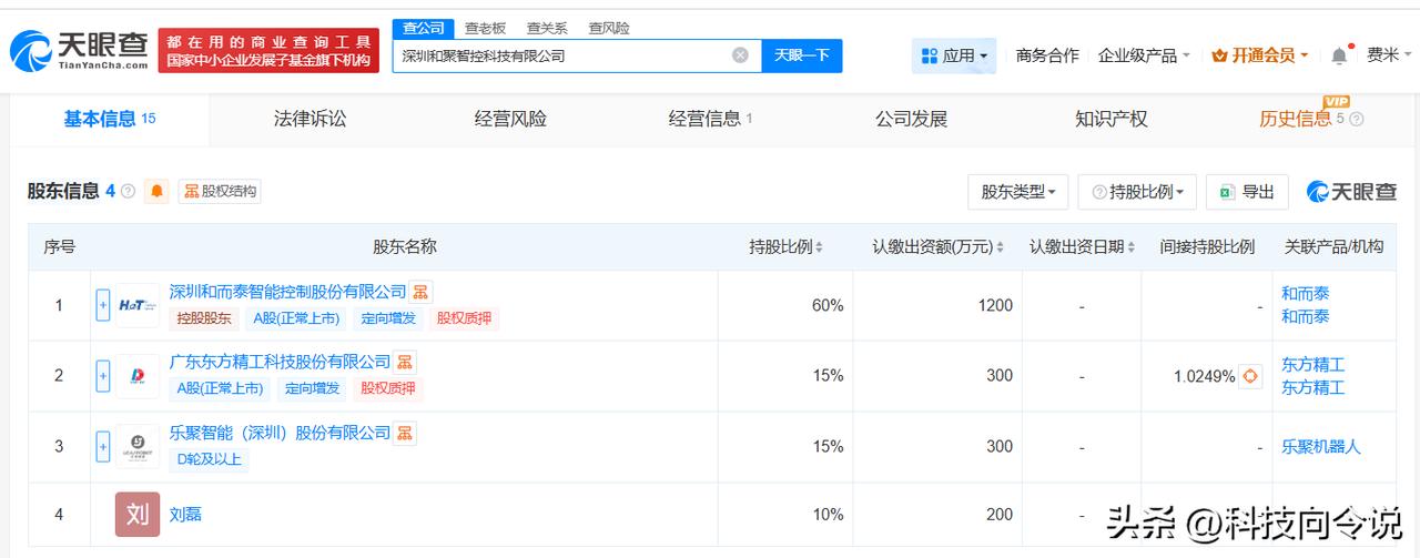 【和而泰、东方精工等成立智控科技公司 注册资本2000万】 天眼查App显示,近日,深圳和聚智控科技有限公司成立,法定代表人为白清利,注册资本2000万人民币,经营范围包括智能机器人的研发、智能机器人销售、人工智能基础资源与技术平台等,由和而泰(002402)、东方精工(002611)、乐聚智能(深圳)股份有限公司、刘磊共同持股。 天眼查信息: