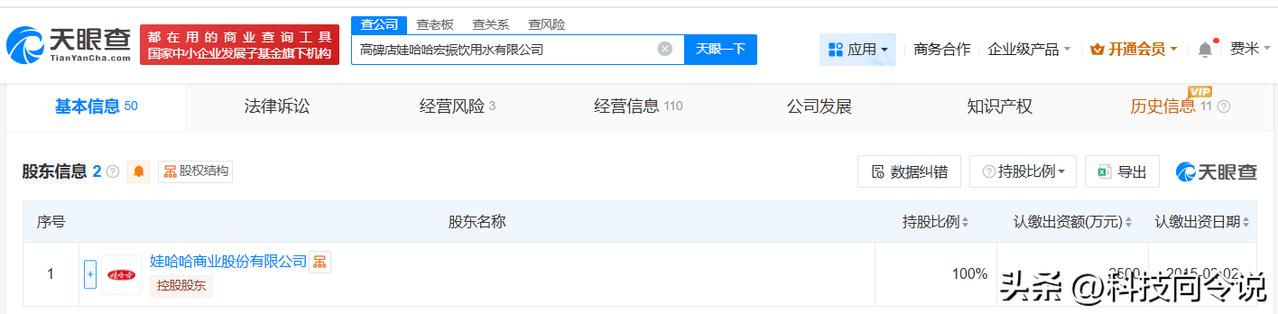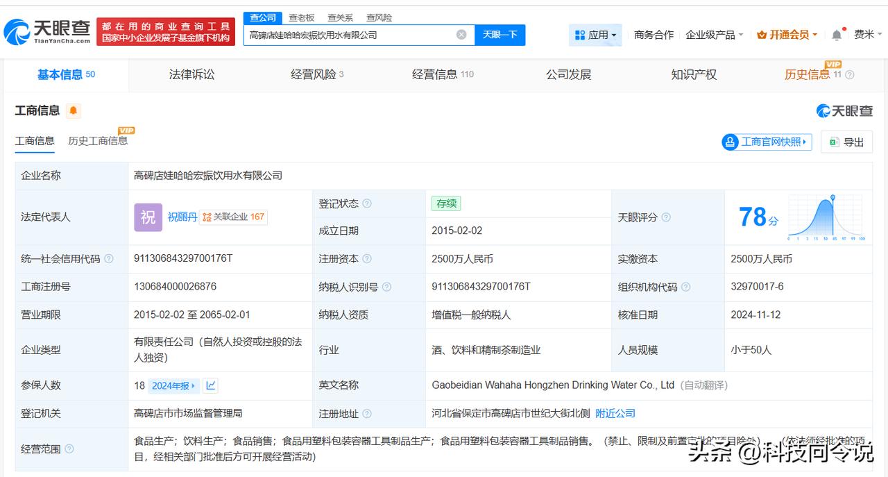 【高碑店娃哈哈宏振饮用水公司拟注销】 天眼查经营风险信息显示,近日,高碑店娃哈哈宏振饮用水有限公司新增一则简易注销公告,公告期为9月28日至10月18日。 该公司成立于2015年2月,法定代表人为祝丽丹,经营范围包括食品生产、饮料生产、食品销售等,由娃哈哈商业股份有限公司全资持股。 天眼查信息: