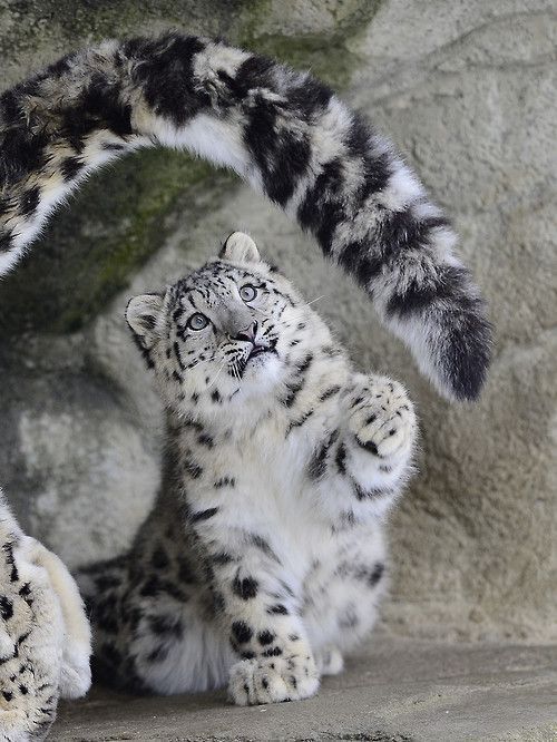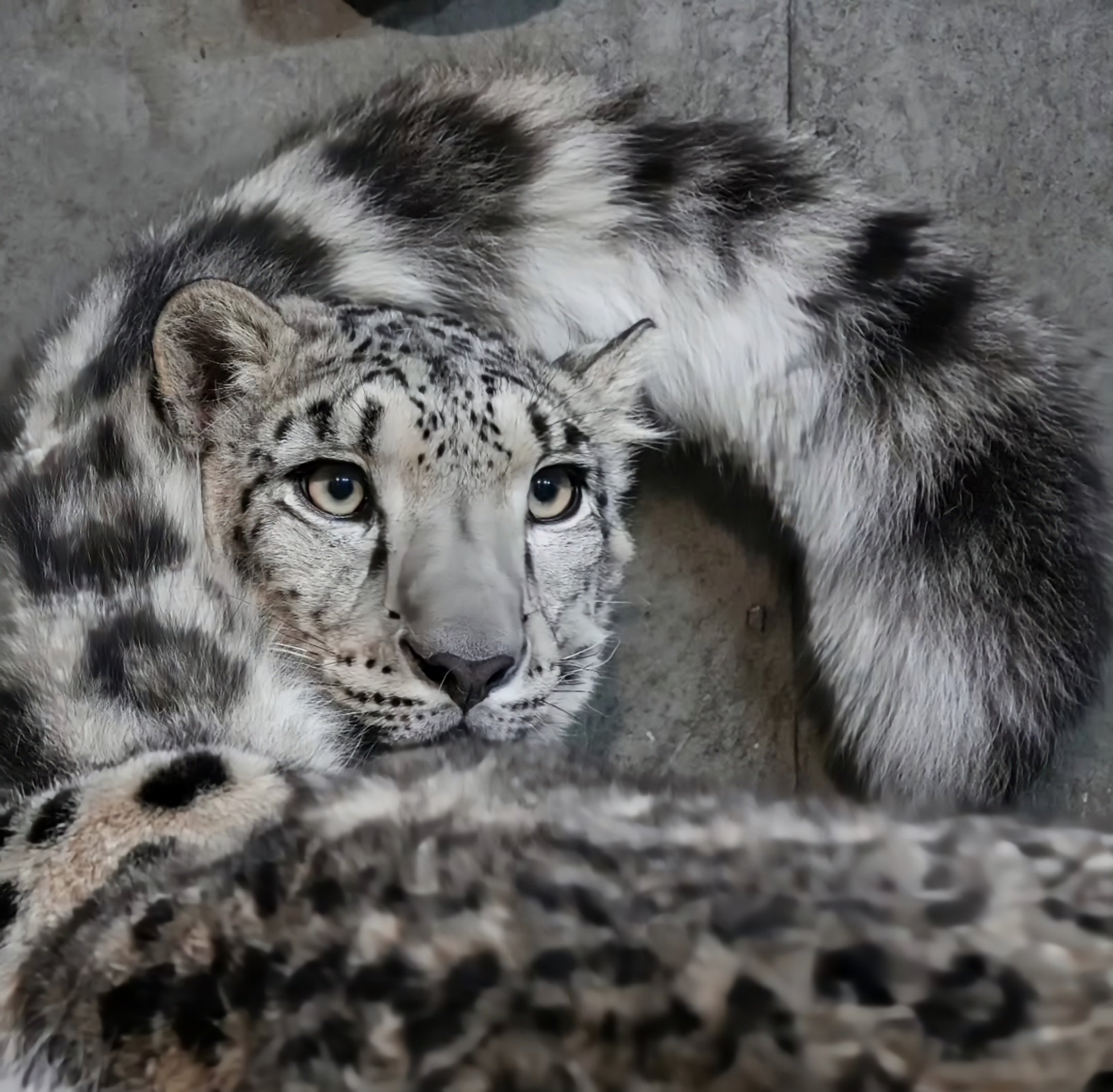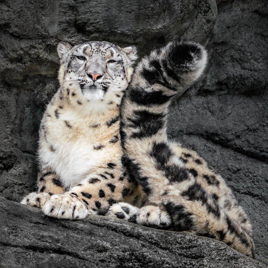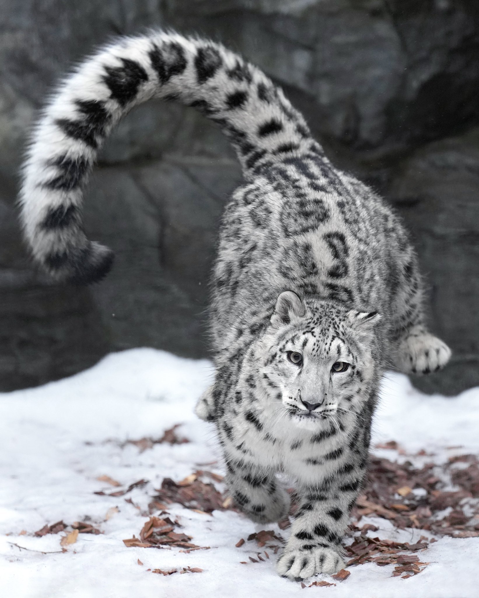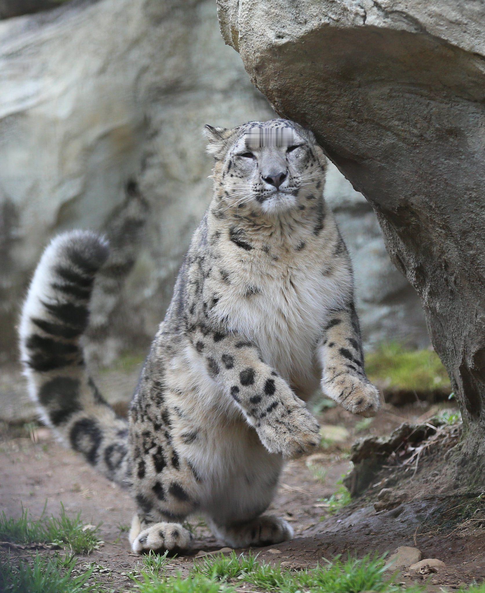 雪豹粗大且毛绒绒的尾巴,不仅在严寒的户外可以为它们保暖,更重要的是在陡峭的山壁上追逐猎物时,尾巴还能很好地为身体提供平衡支撑~