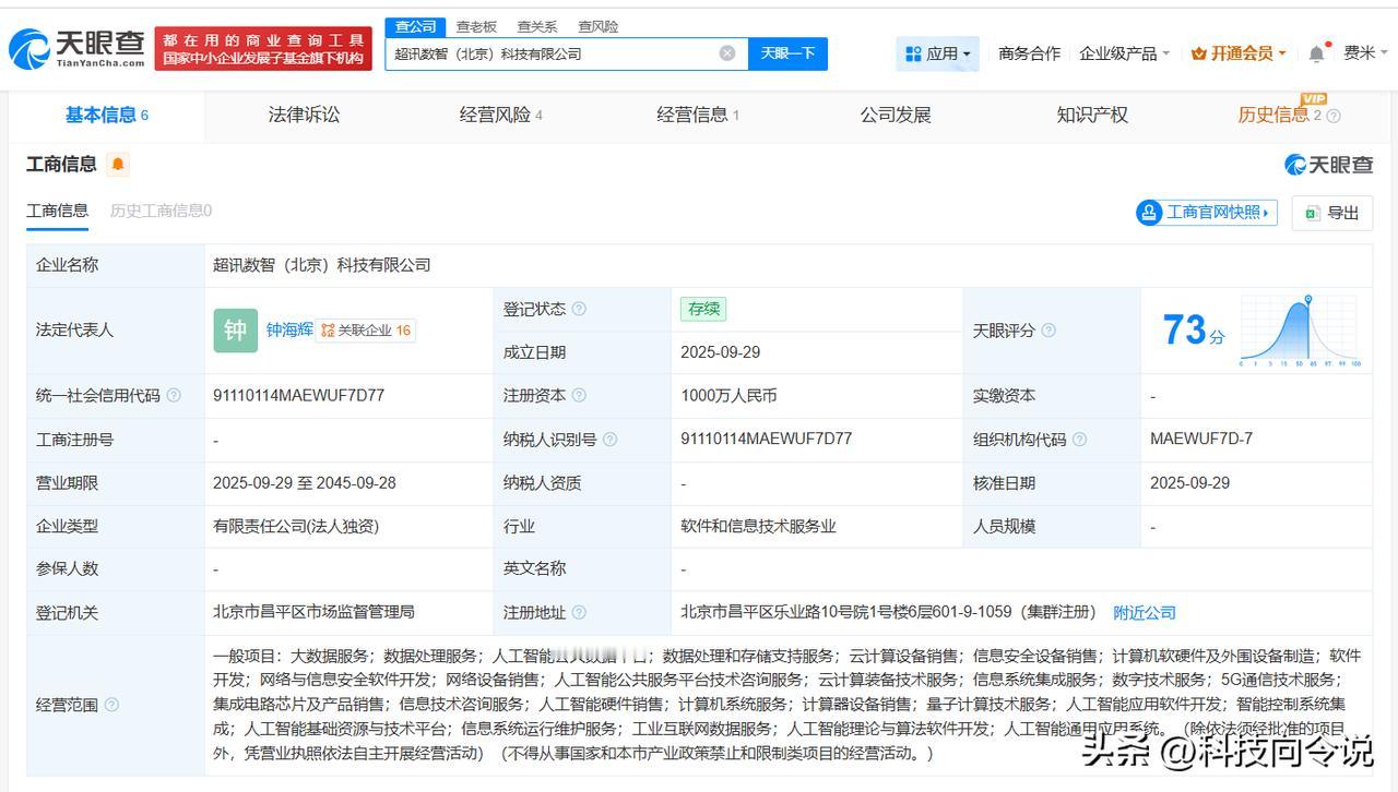 【超讯通信在北京成立数智科技公司 注册资本1000万】 天眼查App显示,近日,超讯数智(北京)科技有限公司成立,法定代表人为钟海辉,注册资本1000万人民币,经营范围包括人工智能公共数据平台、人工智能公共服务平台技术咨询服务、云计算装备技术服务等,由超讯通信(603322)全资持股。 天眼查信息: