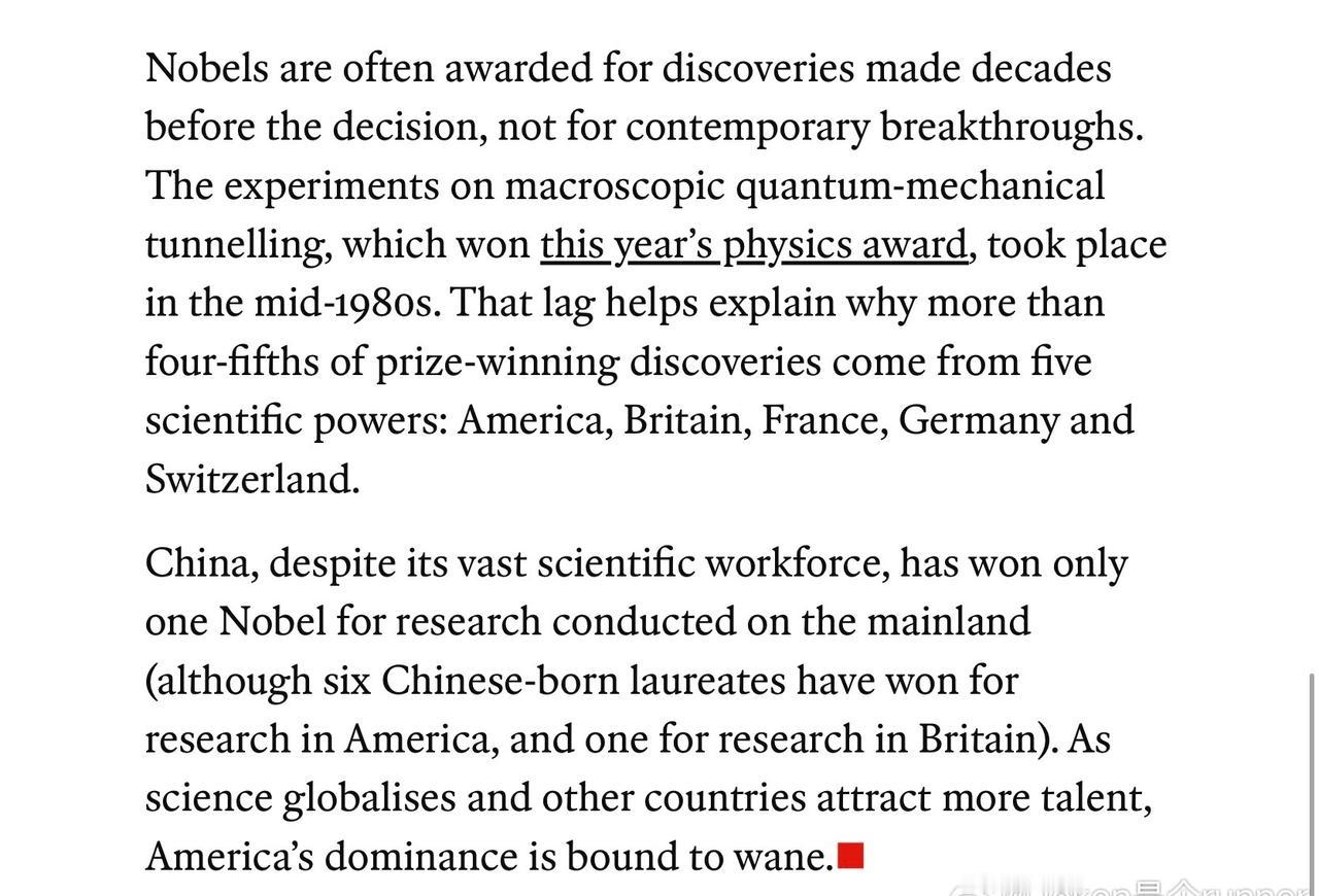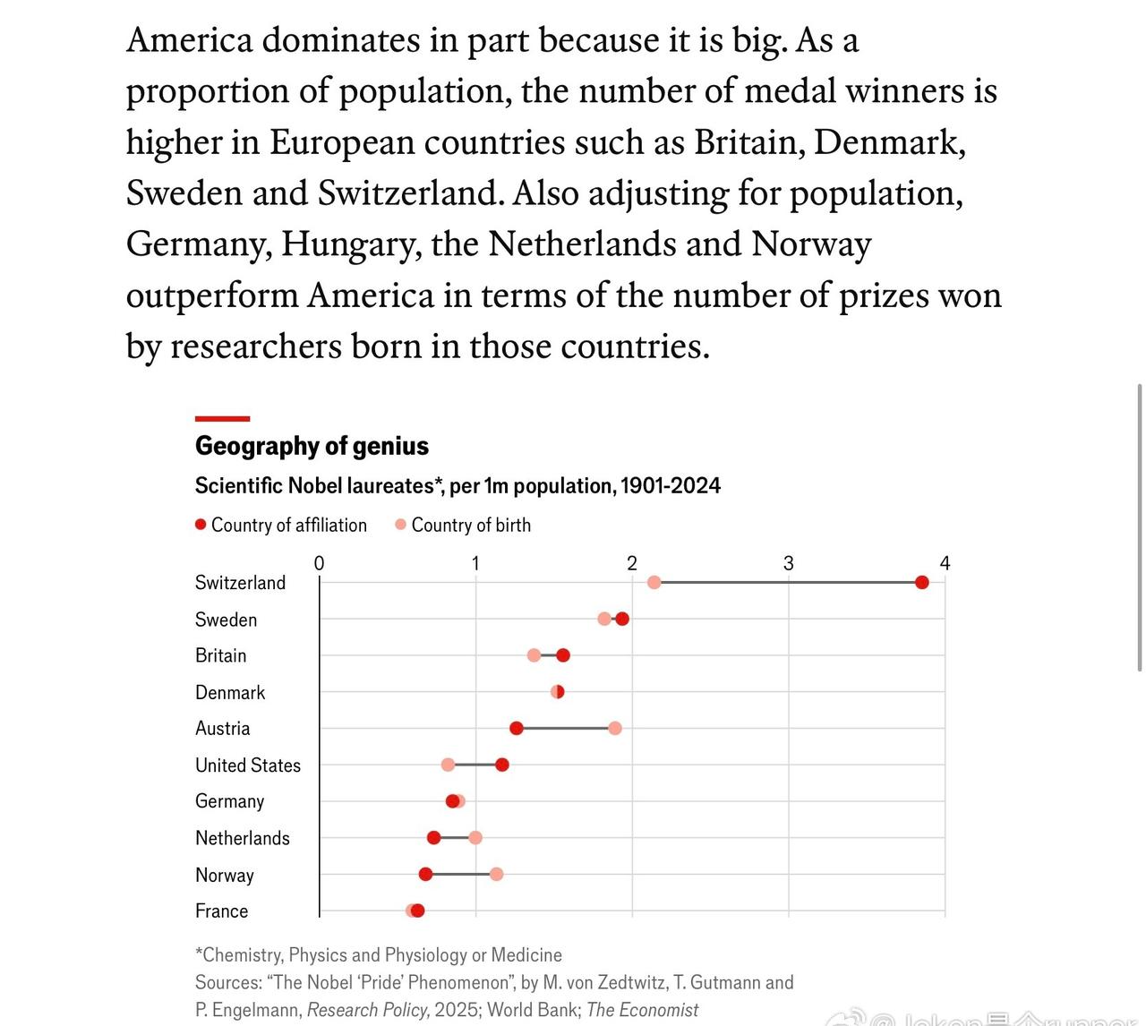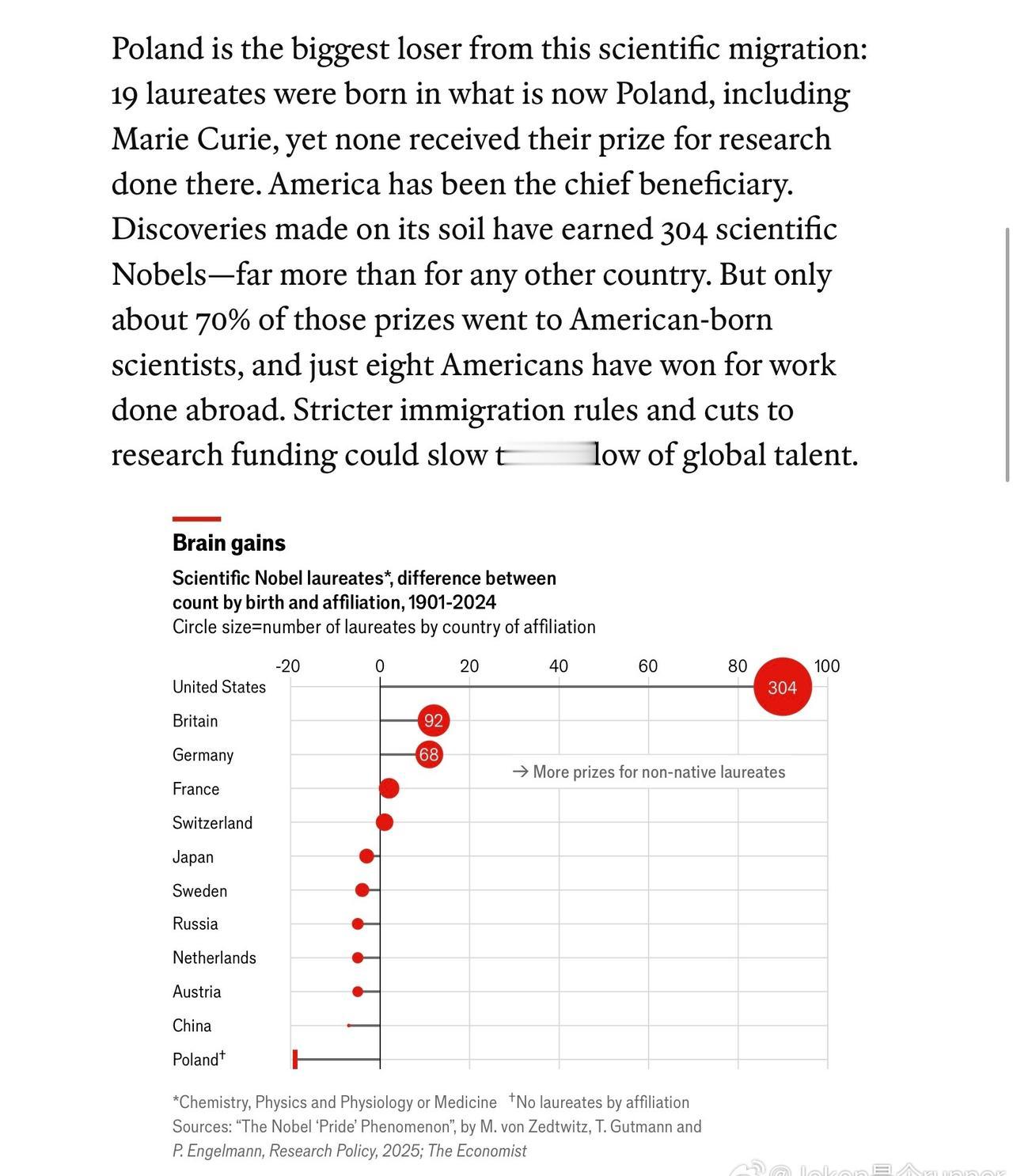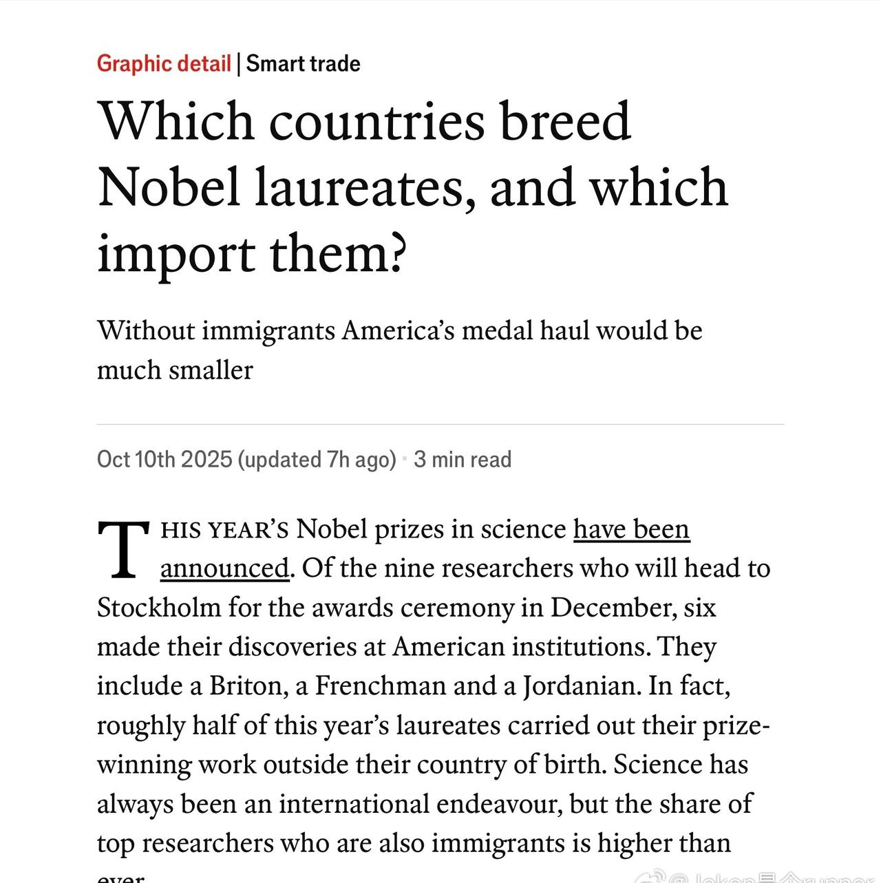 经济学人的图表:哪些国家“培育”诺贝尔奖得主,哪些国家“进口”他们? Which countries breed Nobel laureates, and which import them? Without immigrants America's medal haul would be much smaller没有移民,美国的奖牌数量将大幅减少 今年的诺贝尔科学奖已经揭晓。将在12月前往斯德哥尔摩领奖的九位研究人员中,有六位是在美国的科研机构完成其获奖研究的。其中包括一位英国人、一位法国人和一位约旦人。事实上,今年大约有一半的获奖者是在出生国以外完成其获奖工作的。科学一直是国际性的事业,但如今顶尖研究者中移民的比例比以往任何时候都高。 自1901年首届诺贝尔奖颁发以来,大约30%的获奖者在取得重大突破前曾移居他国——这一数据来自瑞士圣加仑大学的马克斯·冯·泽德维茨(Max von Zedtwitz)及德国EBS商法大学的研究团队。两次世界大战之间,由于人口流动减少,这一比例一度下降,但近几十年来又再次上升。20世纪90年代和21世纪初,美国本土出生的科学家在国内完成研究的比例一度上升,但此后外国出生的科学家比例再次增加。 波兰是这种“科学迁徙”的最大失利者:共有19位诺贝尔奖得主出生于如今的波兰(包括玛丽·居里),但没有任何人在波兰完成获奖研究。美国则是最大的受益者。在美国本土完成的科研成果共获得了304项科学类诺贝尔奖——远超其他任何国家。然而,这其中只有约70%的奖项授予了美国本土出生的科学家,且仅有8位美国人因在国外完成的研究而获奖。更严格的移民政策和科研经费削减,可能会减缓这种全球人才流入的趋势。 美国之所以在诺贝尔奖上占据主导地位,部分原因是其体量庞大。若按人口比例计算,英国、丹麦、瑞典和瑞士等欧洲国家的人均获奖数更高。若进一步考虑出生地因素,德国、匈牙利、荷兰和挪威在本国出生科学家获得的奖项数上,也优于美国。 诺贝尔奖通常授予在数十年前完成的研究成果,而非最新突破。例如,今年物理学奖所表彰的宏观量子隧穿实验,最初进行于20世纪80年代中期。这种时间滞后部分解释了为何五个科学强国——美国、英国、法国、德国和瑞士——贡献了超过五分之四的获奖研究。 尽管中国拥有庞大的科研队伍,但至今仅有一项在中国大陆完成的研究获得诺贝尔奖(不过,有六位出生于中国的科学家因在美国完成的研究获奖,另有一位因在英国的研究获奖)。随着科学全球化加深、更多国家吸引国际人才,美国的主导地位势必会逐渐减弱。