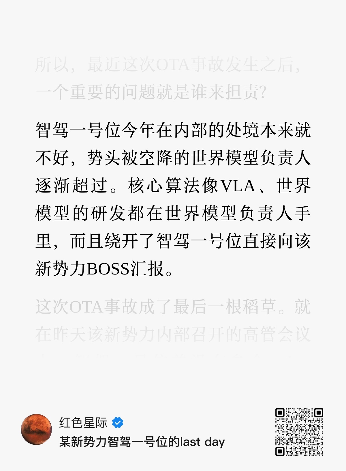 1️⃣最近OTA事故引发用户强烈不满和吐槽,成为该智驾一号位离职的催化剂。