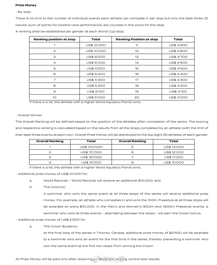 打破世界纪录将获得额外10000刀奖金;包揽三站同一个项目全部冠军将获得额外10000刀奖金。