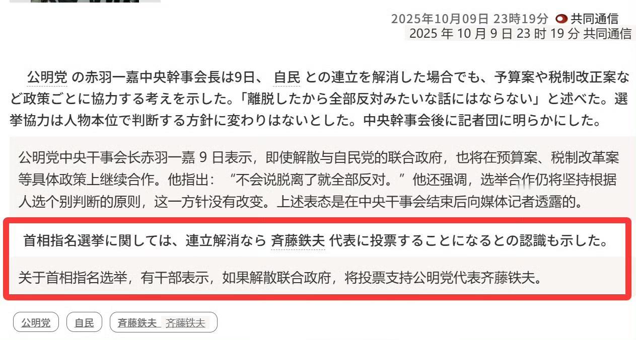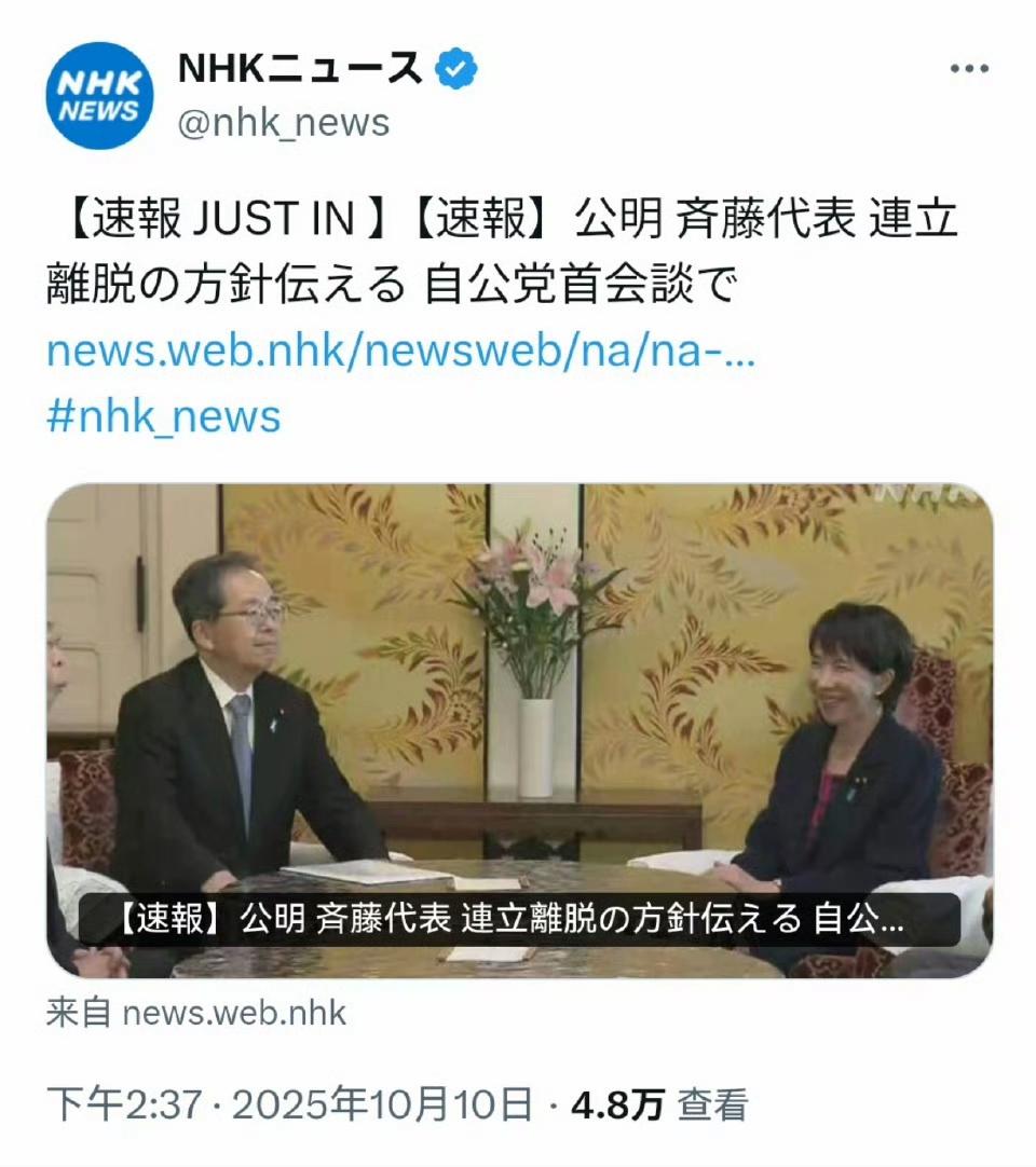 早苗变死苗,早苗想对抗东大结果自己内部先散伙了!10月10日日本公明党向自民党新