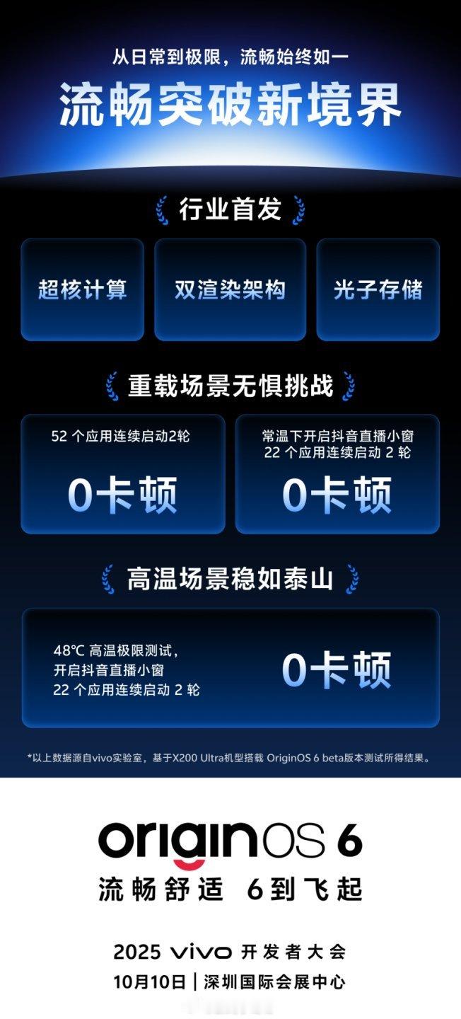 当然在这样硬核的基础下,重载场景多应用、长时间、极限环境测试都是0卡顿!这就是OriginOS6的实力!为了做好这一流畅的效果,vivo自研蓝河流畅引擎,在底层上就为手机性能释放准备了充足的空间,堪称机德芙!