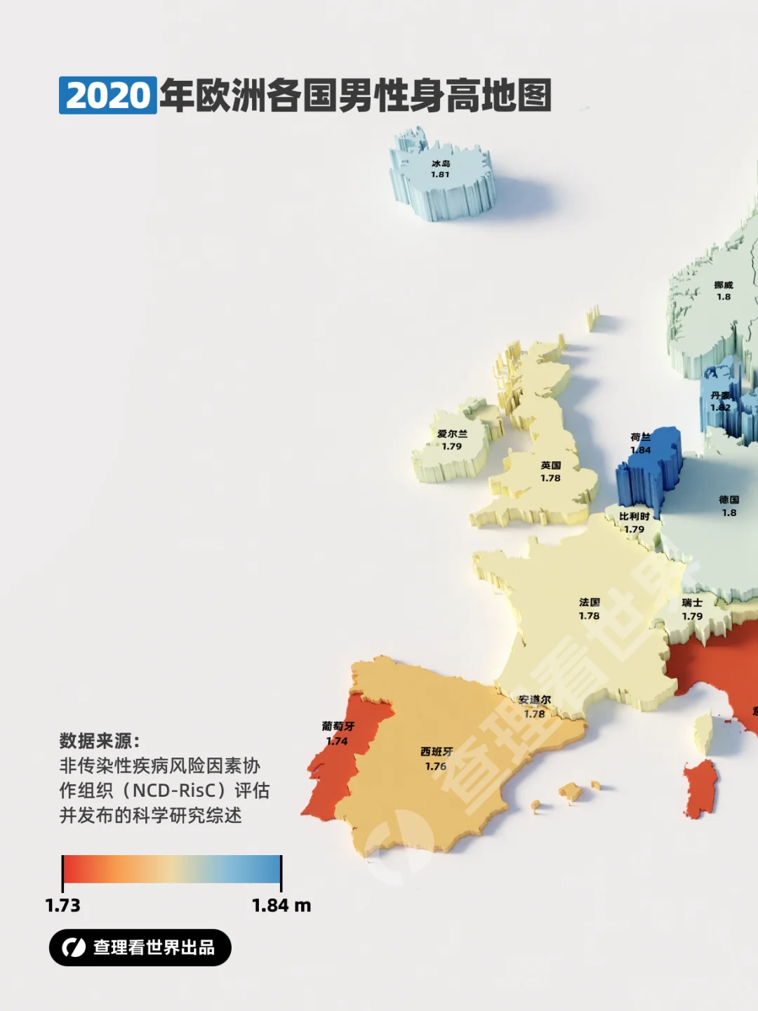 [私信R]数据来源: 非传染性疾病风险因素协作组织(NCD-RisC)评估并发布的科学研究综述。 [种草R]特别说明: 因各种与身高相关的研究方法、统计方法各有不同,本张图表出示了明确的数据来源,所展示的内容仅供参考,没有任何倾向性和做任何价值判断,请评论区客观理性讨论。 ★原创地图内容谢绝转载★ 身高 欧洲 地图 地理 荷兰 法国 北欧