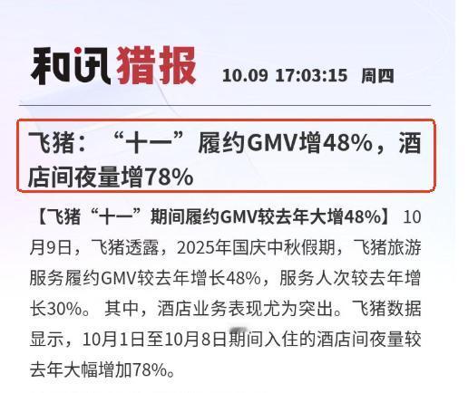 阿里大消费平台战略持续发力,十一旅游市场的变化足以说明一切![灵光一闪] 就在近日,飞猪公布了2025年国庆中秋假期业绩,其中提到履约GMV相比去年增长48%,服务人次较去年增长30%。 可以看出,飞猪的发展势头很不错,但大家可能更好奇,飞猪的核心指标增速放在行业算是什么水平?让人意外的是,飞猪用户规模增速居然接近整体市场2倍,交易规模增速更是达到整体市场的3倍多。 虽然说十一是旺季,但是飞猪的爆发式增长,显然不只与假期出游需求旺盛有关,还有一个很重要的原因就是阿里大消费平台战略下,飞猪带给用户的体验越来越好。 对于用户来说,平台能提供什么样的旅游服务是最重要的,谁的体验好,就选择谁,这里没什么好说的。关键就在于谁能把服务搞好,现在来看,飞猪已经走在了正确的路上。 此前,阿里将飞猪、饿了么并入中国电商事业群,持续推动大消费平台战略。说直白点,就是通过打通生态,实现旅游、购物、外卖等场景的无缝衔接,用户做这些事儿更方便了。 举个例子,用户在淘宝浏览商品时可直接通过淘宝APP上的“飞猪”一级入口,直接预订机票或酒店,无需跳转其他平台。 再加上淘宝大会员体系,将用户权益打通,实现权益翻倍,极大提升了飞猪的竞争力。我们也可以看到,在飞猪加入中国电商事业群100天之际,也就是今年国庆首日,飞猪国内机票单日履约票数率先突破新高,之后境内外酒店也都创下了新纪录。 用户体验提升是一方面,商家得到的利好也是看得见的,阿里大消费平台战略,让商家流量和高消费力客群迎来强劲增长。比如10月1日到10月8日,88VIP用户为酒店带来的间夜量增长了120%。 感觉随着阿里大消费平台战略持续发力,飞猪留给市场的想象空间还很大。