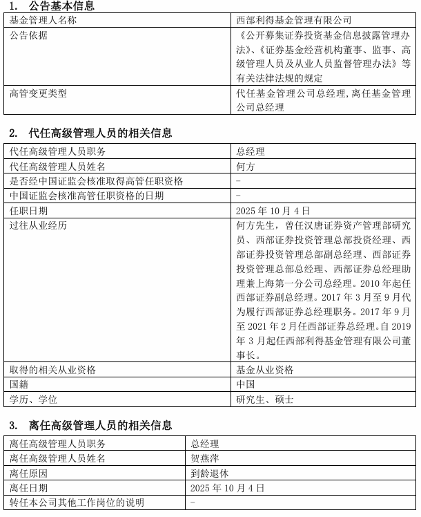 10月10日,西部利得基金发布高管变更公告称,贺燕萍于10月4日到龄退休,卸任公司总经理一职,董事长何方同日起暂代总经理职务。