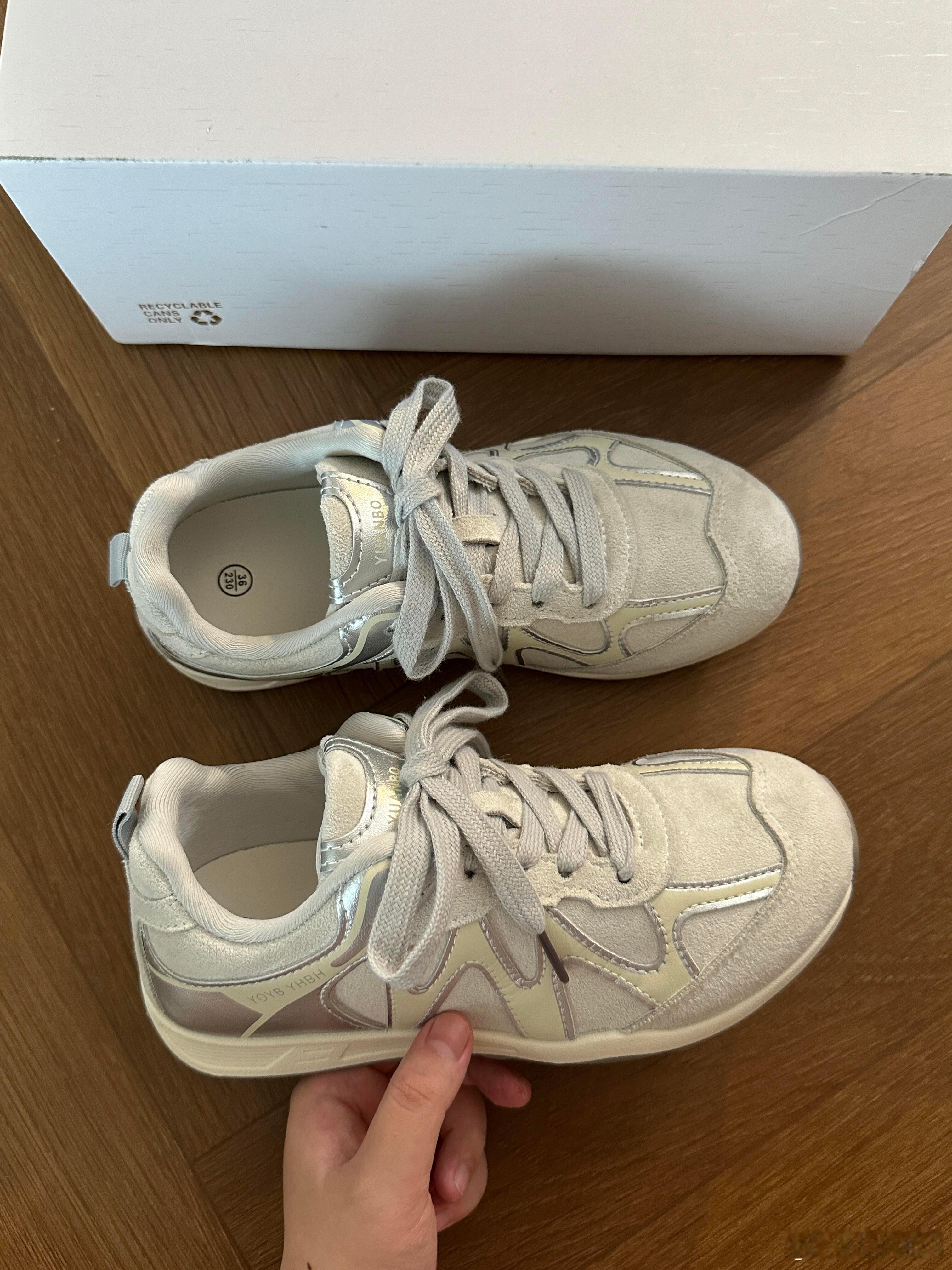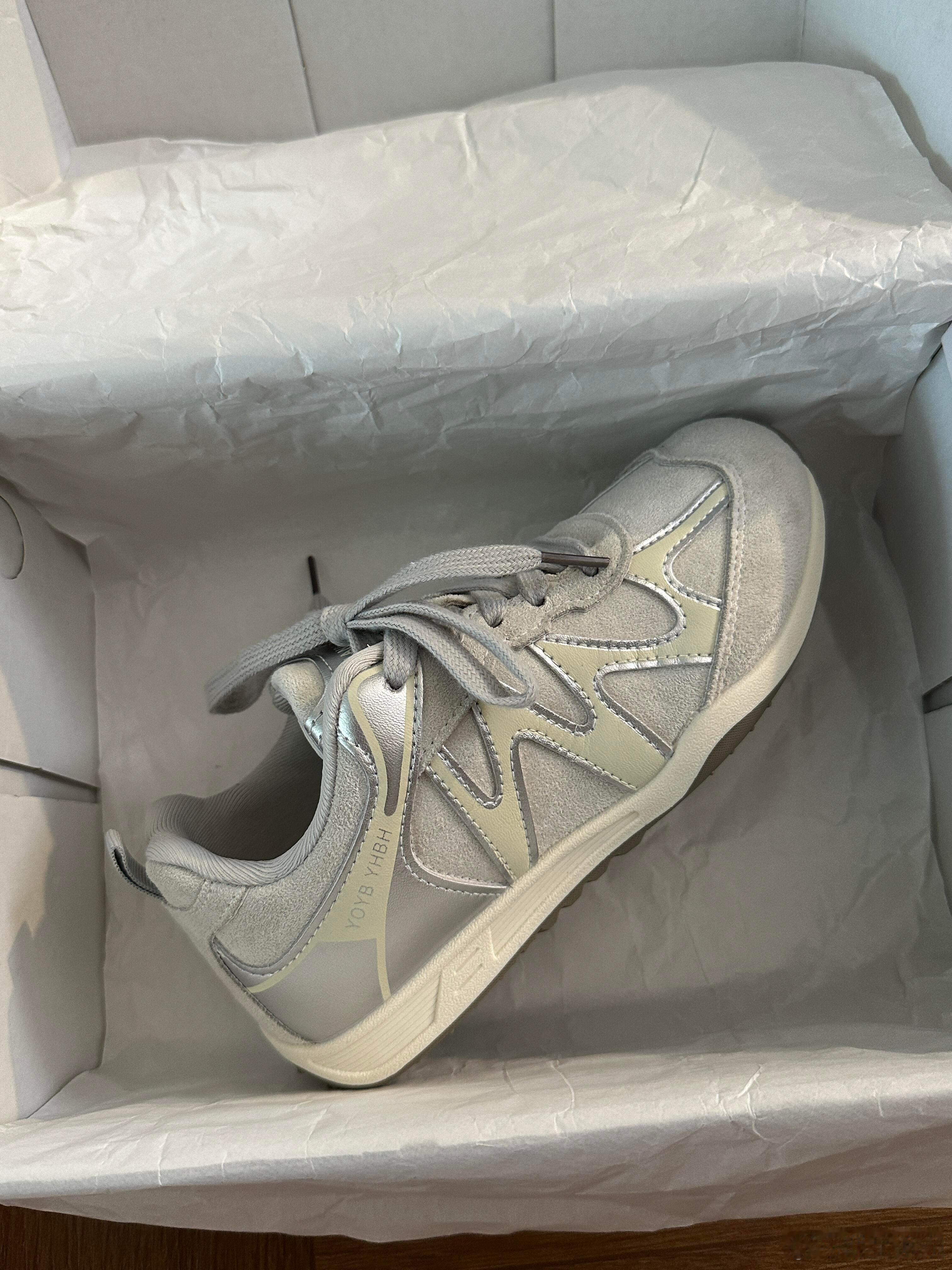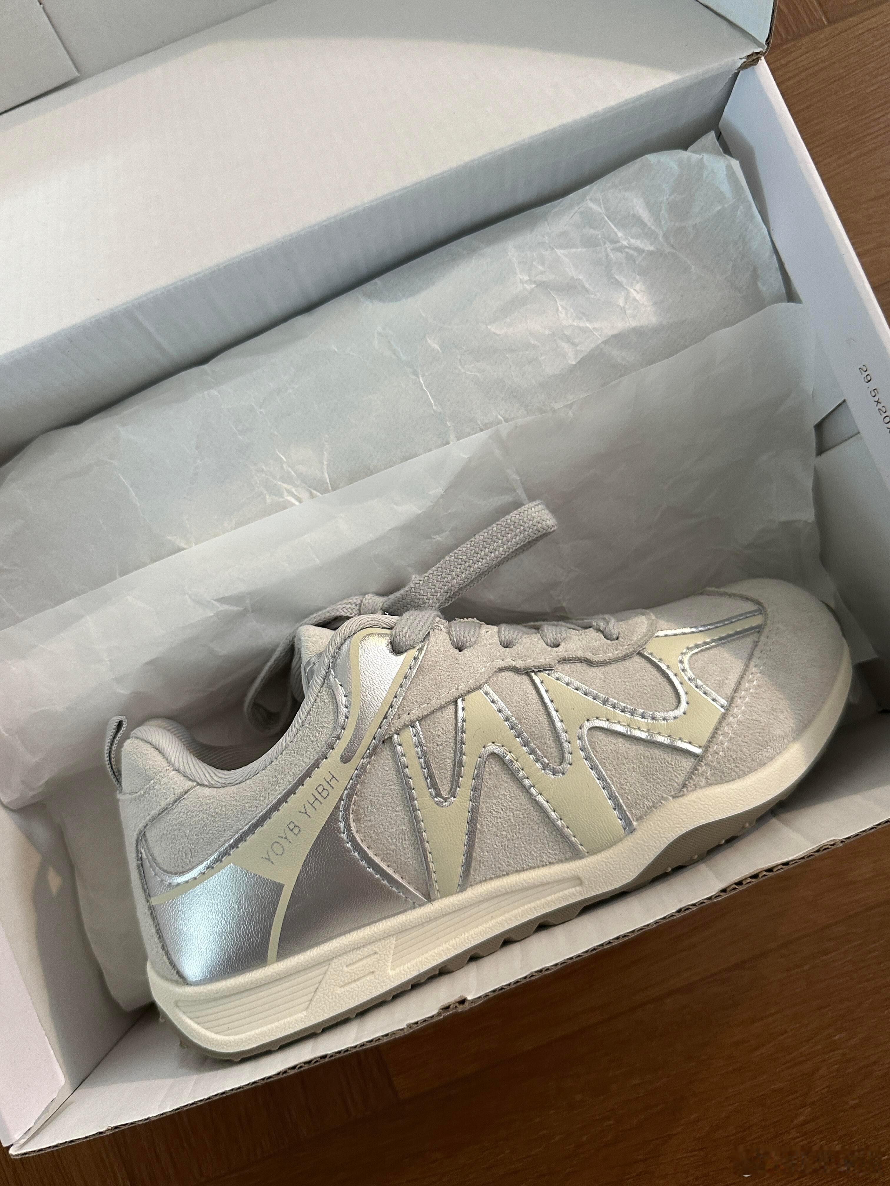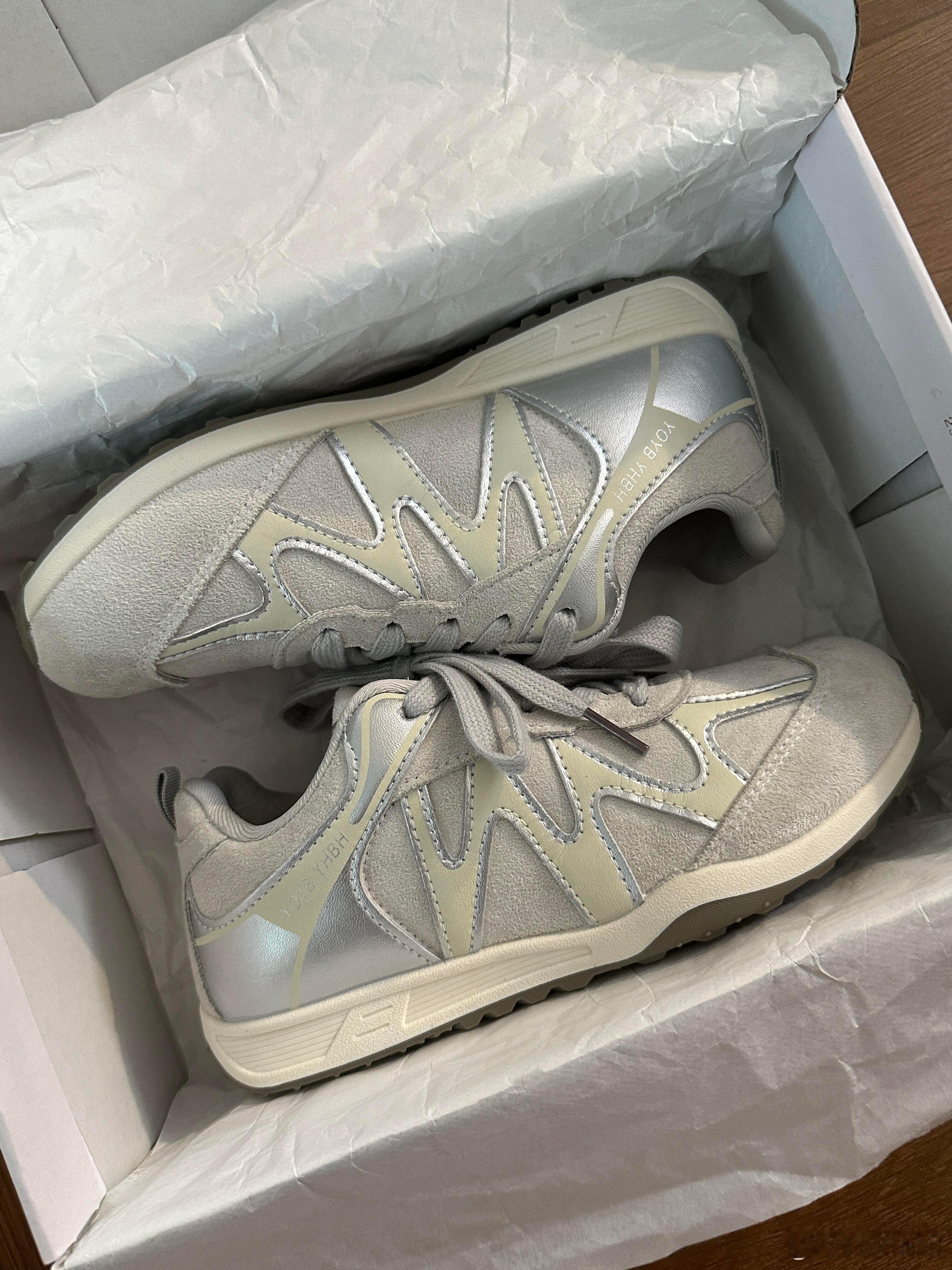 这双运动鞋以其清新的浅灰与米白配色,呈现出简约的现代美学。鞋身采用织物与类麂皮材质拼接,质感丰富。最引人注目的是鞋侧贯穿的银色反光条纹,其独特的“W”形流线设计不仅极具视觉辨识度,更提升了夜间行走的安全性。鞋子被妥善放置于铺有褶皱衬纸的纯白鞋盒内,全新的状态一览无余。鞋舌与鞋帮处的“YOKAIBOKU”等品牌标识清晰可见。整体设计融合了休闲舒适感与科技运动风,干净的色调与利落的线条使其成为日常穿搭中易于搭配的时尚单品,风格清新而富有活力。时尚鞋履SOTD鞋控的日常