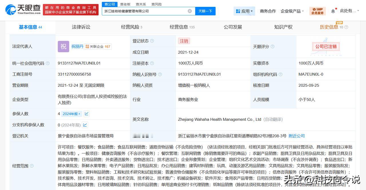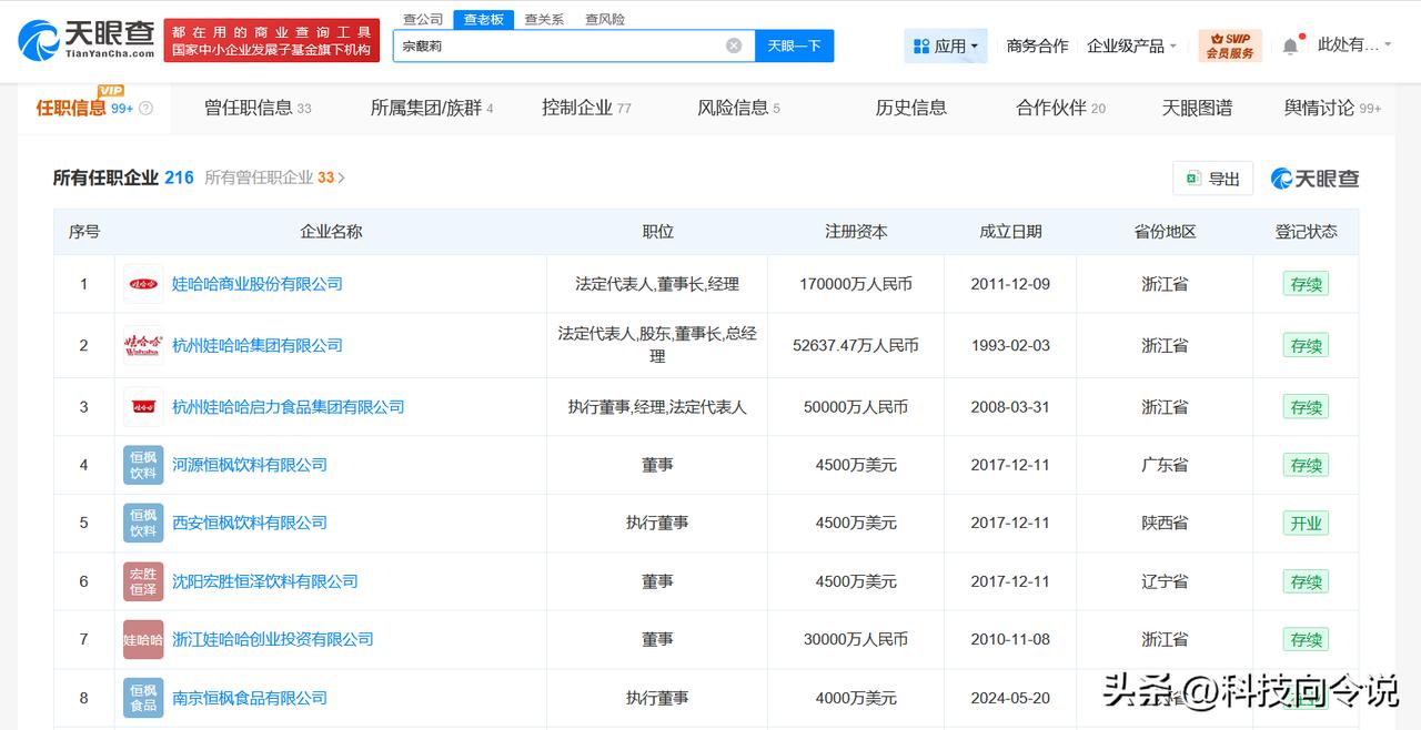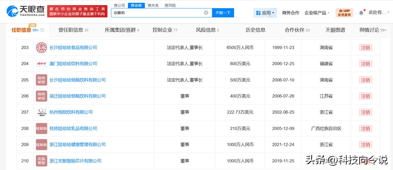【宗馥莉已两次提出辞职 宗馥莉名下多家娃哈哈关联公司已注销 宗馥莉近期接连注销名下公司】宗馥莉 据媒体报道,10月10日晚,自一位娃哈哈内部人士获悉,宗馥莉已于9月12日向娃哈哈集团有限公司辞去公司法人代表、董事及董事长等相关职务并已通过集团股东会和董事会的相关程序。娃哈哈集团表示,宗馥莉辞职属实。值得注意的是,宗馥莉在2024年7月也曾提出辞职,辞去娃哈哈集团副董事长、总经理职务。 天眼查任职信息显示,宗馥莉名下关联210余家企业,其中200余家为存续或开业状态,包括娃哈哈商业股份有限公司、杭州娃哈哈集团有限公司等。值得注意的是,宗馥莉名下10余家企业已注销。其中,浙江娃哈哈健康管理有限公司、浙江宏振智能芯片有限公司、浙江德清娃哈哈科技创新中心有限公司于近期注销。此外,南京娃哈哈宏振饮用水有限公司、江山娃哈哈宏振饮用水有限公司也于近期发布简易注销公告。 天眼查信息:-c408950227