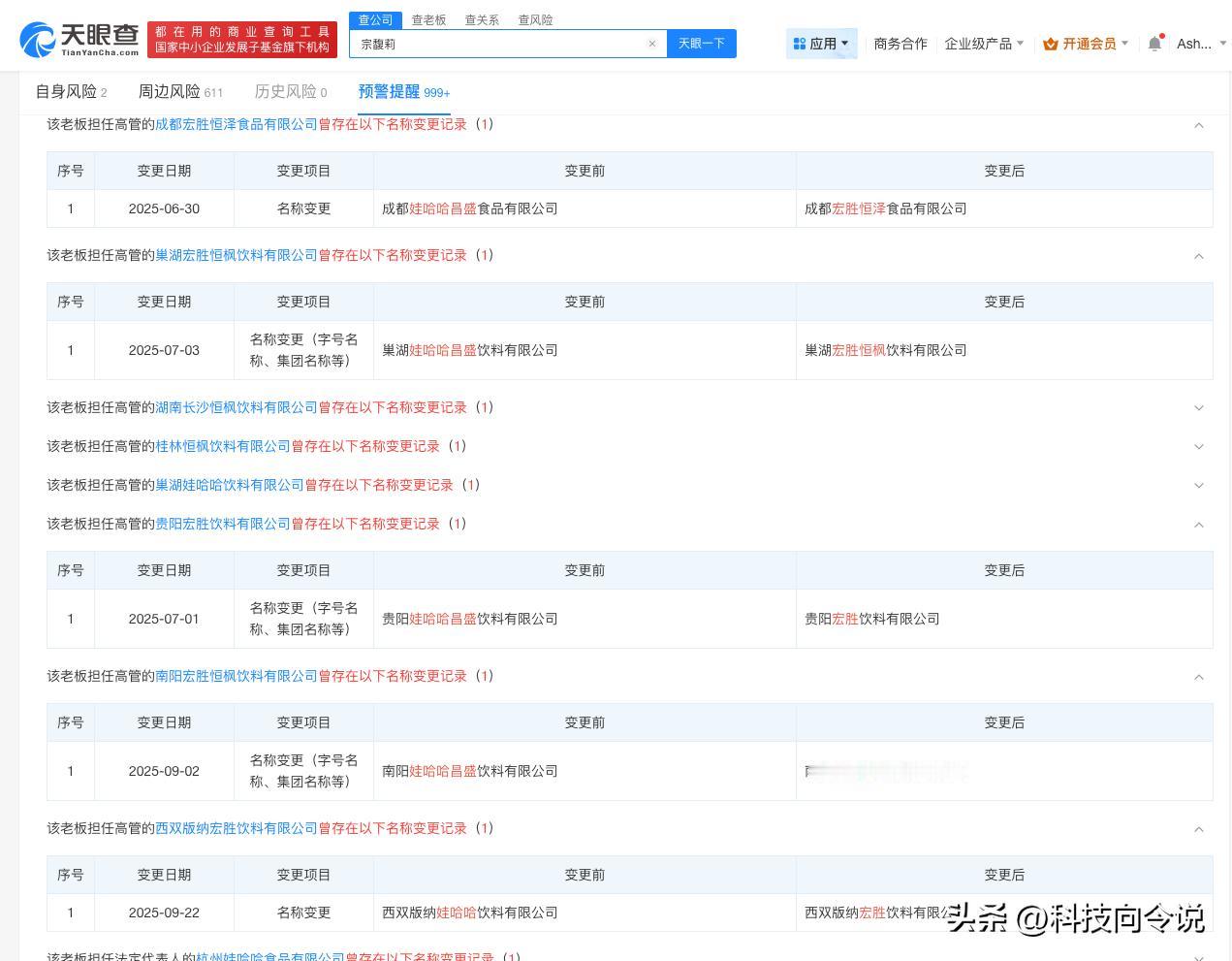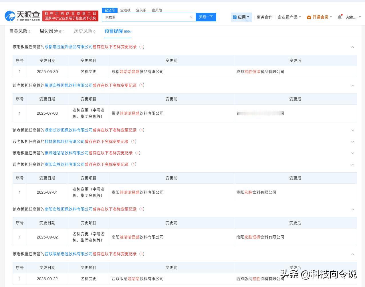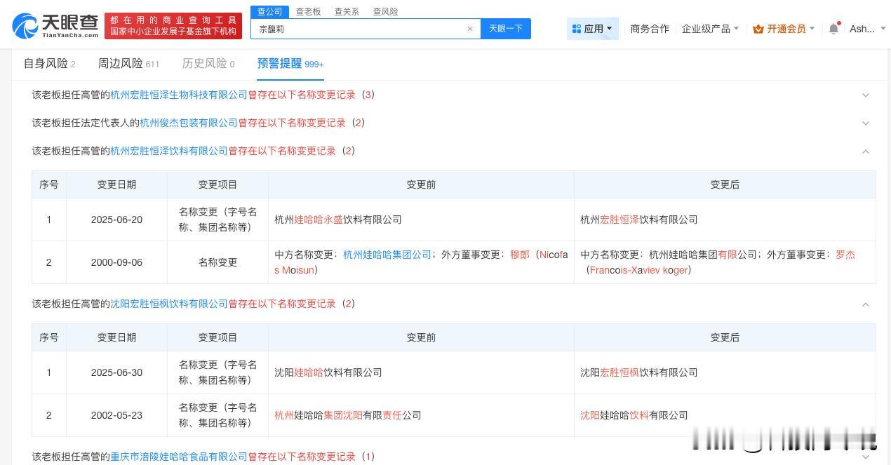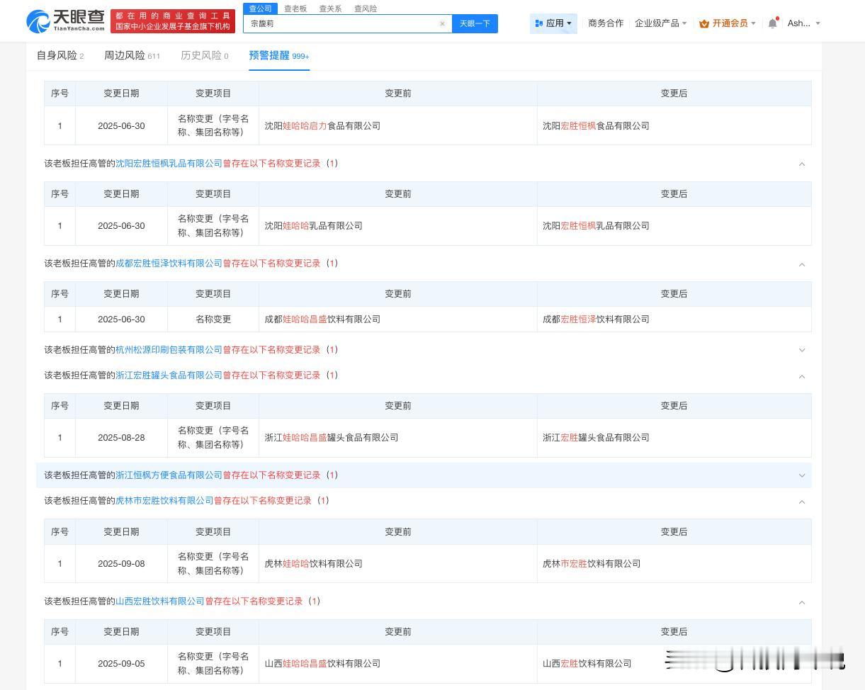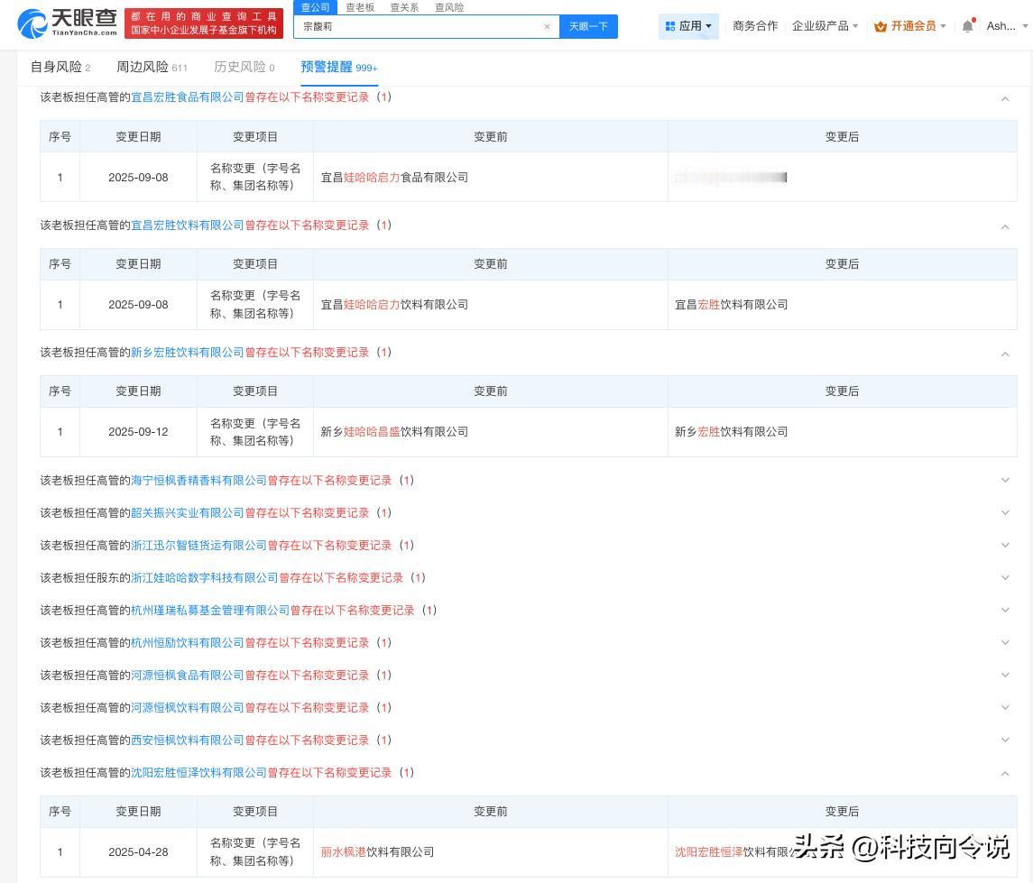 【宗馥莉辞职前娃哈哈多家公司更名宏胜 娃哈哈旗下多地公司9月更名为宏胜】宗馥莉 据媒体报道,记者从接近娃哈哈的人士了解到,宗馥莉已于9月12日向娃哈哈集团有限公司辞去公司法人代表、董事及董事长等相关职务并已通过集团股东会和董事会的相关程序。一名消息人士表示,宗馥莉此次辞职,是因为商标使用“不合规”,宗馥莉决定经营自己的品牌“娃小宗”。 天眼查App显示,天眼查App显示,9月以来,多地娃哈哈关联公司发生工商变更,企业名称变更为宏胜,包括西双版纳宏胜饮料有限公司、宜昌宏胜饮料有限公司等,此外,今年以来已有超十家娃哈哈旗下公司发生工商变更,企业名称变更为宏胜,包括杭州宏胜恒泽饮料有限公司、白山宏胜饮料有限公司等。 天眼查信息:-c559983174
