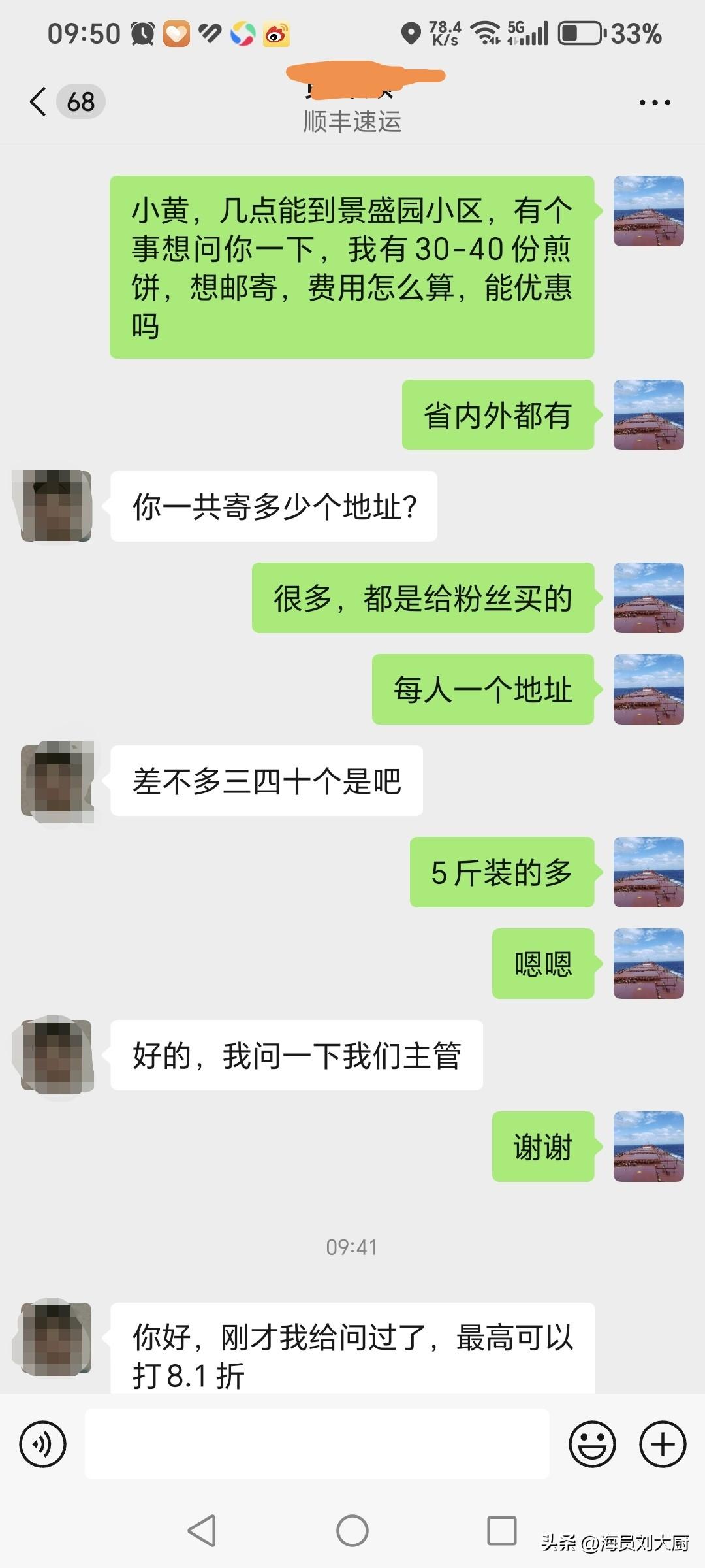 昨天我去询问了煎饼店老板,并且要了电话和微信,老板也非常同意给网友发货,但是今天她又说,没有合作的快递公司,快递费太贵了,比煎饼钱贵了很多。 今天我又联系了**快递,说是最多能给优惠8.1折,这样就能便宜了一些,我为什么选择**,因为邮寄速度快,本省的基本上第二天就到了,外省的差不多第三天就到了。 费用还是本省的起步13元(包含1公斤),往上每加一斤,费用加一元钱,5斤的话,总共16元,打8.1折是13元,加上煎饼钱5×2.8=14元总共27元。(大约这些钱) 外省的费用16元起步(包含1公斤),往上每加一斤,费用加3元,5斤的话,总共25元,打8.1折是20.25元,加上煎饼钱5×2.8=14元,总共34.25元。 口味还是有玉米粉的,全麦的,小麦粉的,(2.8元每斤)高粱的(3.4元每斤)还有小米的,如果网友们想要,告诉我就行,直接把口味,重量,邮寄地址(名字,手机号)发给我就行。我只想为支持我的粉丝服务一下。