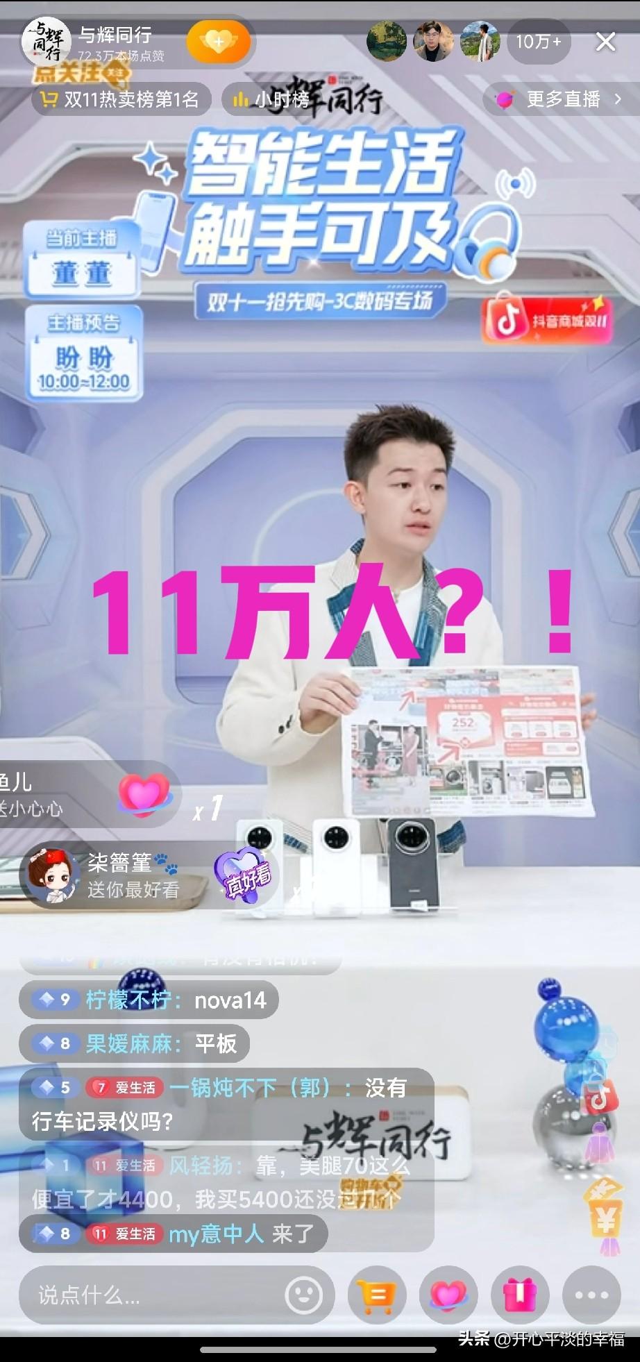 多少人了?11万人,哇这么多,弹幕太快,看不过来了。真的非常感谢大家的支持,祝大家安好!董董与工作人员的对话。 今天的董董,穿了一身休闲正装,高端,清爽,和今天的科技数码专场非常合拍。一早开播董董就觉得不对了,以前大家的问题还能抓住,今天实在太快了,大家的问题看不完呀!原来在线人数太多,大家可能都在等着今天的数码专场了。 最近我老公也给我买了一个新手机,他说抗摔抗水的比较适合我,而容量大。也是OPPO,领了国补以后花了1600多块钱,将近1700。我就和他说,我说等与辉同行专场的时候我们再买,你不要在京东上买,他就是不听。看看吧多花了好几百块钱[害羞]