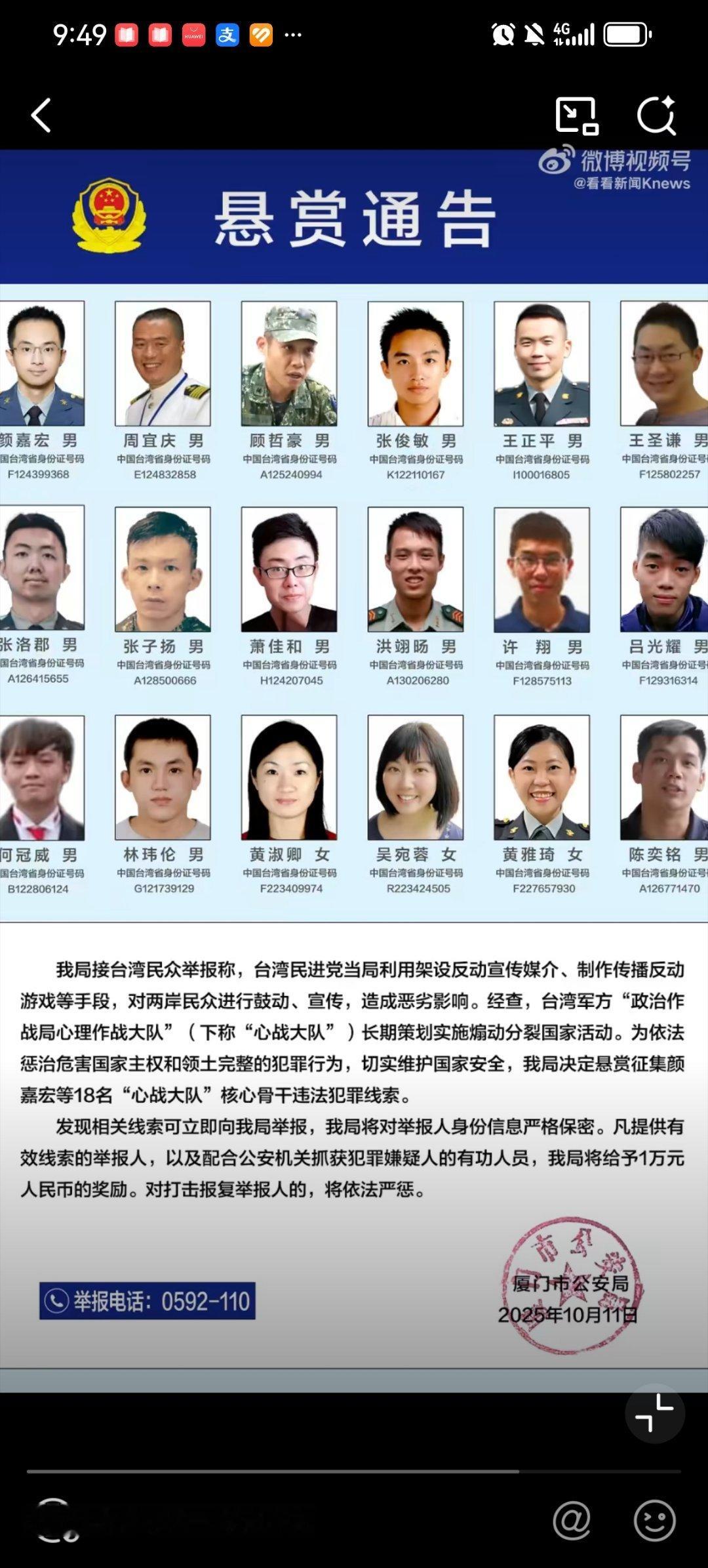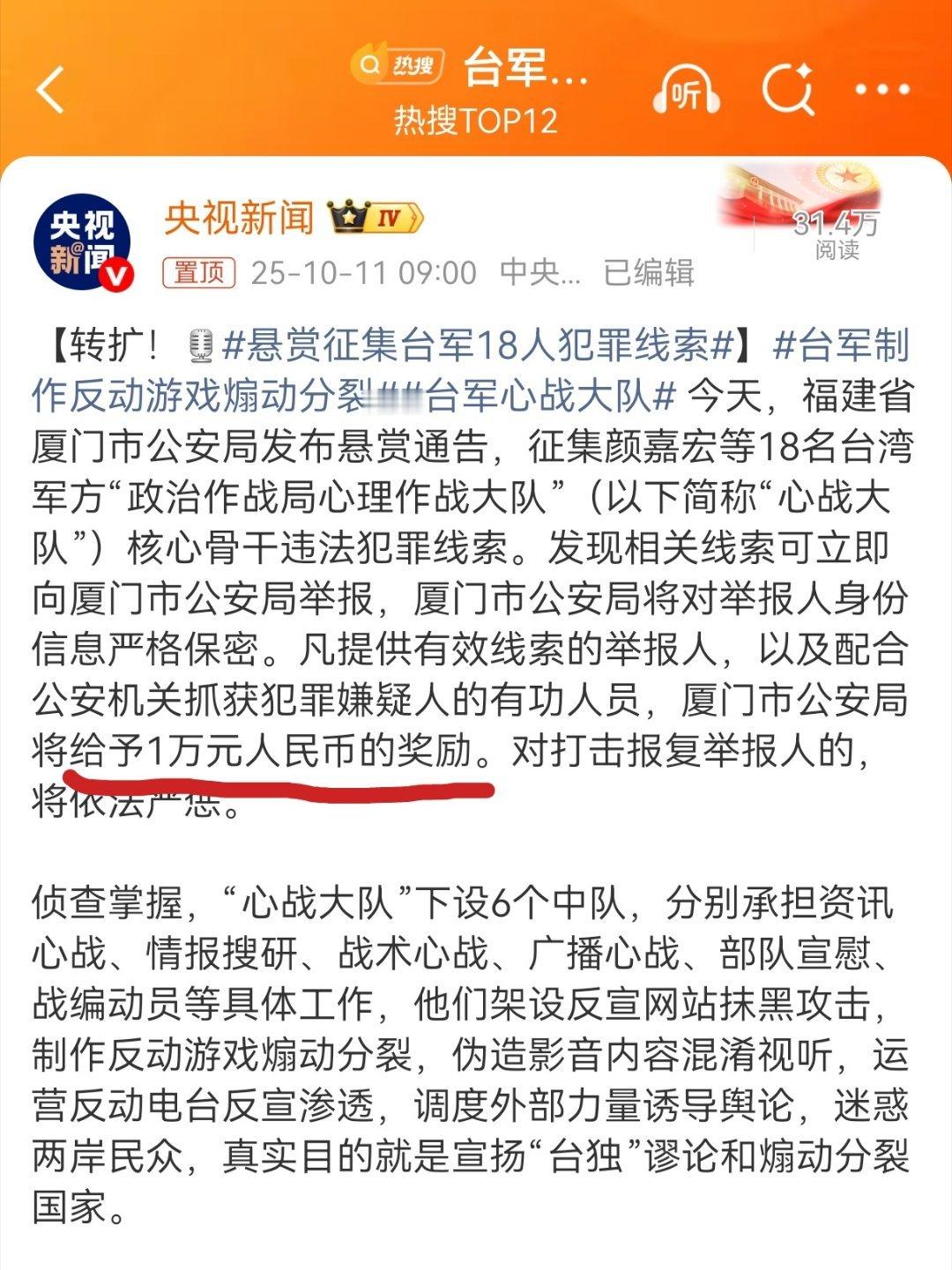 悬赏征集台军18人犯罪线索悬赏一万元![doge]台军心战大队