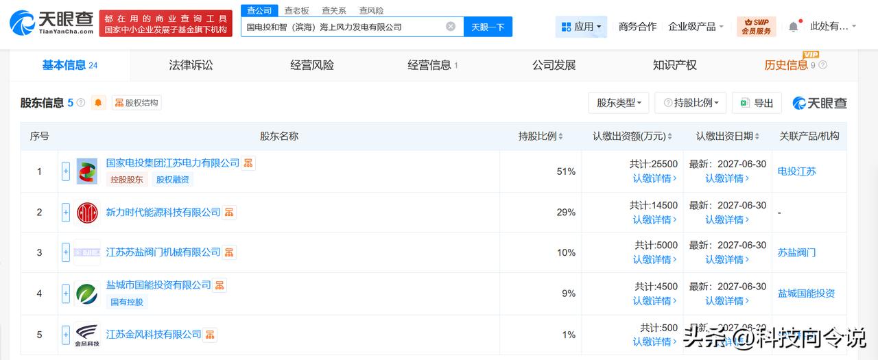 【国家电投集团等在盐城成立海上风力发电公司 注册资本5亿】 天眼查工商信息显示,近日,国电投和智(滨海)海上风力发电有限公司成立,法定代表人为葛前华,注册资本5亿人民币,经营范围含发电业务、输电业务、供(配)电业务,输电、供电、受电电力设施的安装、维修和试验,供电业务,水产养殖等。股东信息显示,该公司由国家电投集团江苏电力有限公司、新力时代能源科技有限公司、江苏苏盐阀门机械有限公司等共同持股。 天眼查信息: