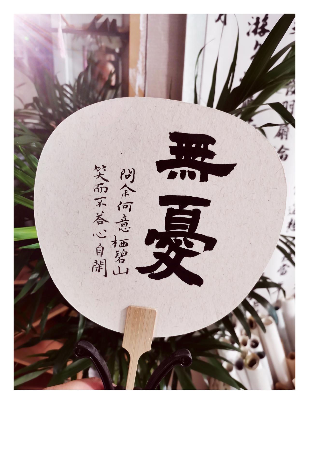 【我的书法文创】 团扇轻摇,摇落满纸墨香。“无忧”二字笔力沉雄,似能镇住世间纷扰;旁侧小字清逸,“问余何意栖碧山,笑而不答心自开”的悠然跃然扇面。竹柄承起的不仅是扇骨,更是一份在笔墨间寻得的静定——当狼毫饱蘸浓墨,于素纸之上缓急提按,那些缠绕心头的琐碎,便随笔画的流转渐渐消散,只余墨色里澄澈的安宁,如碧山风过,心门自开。