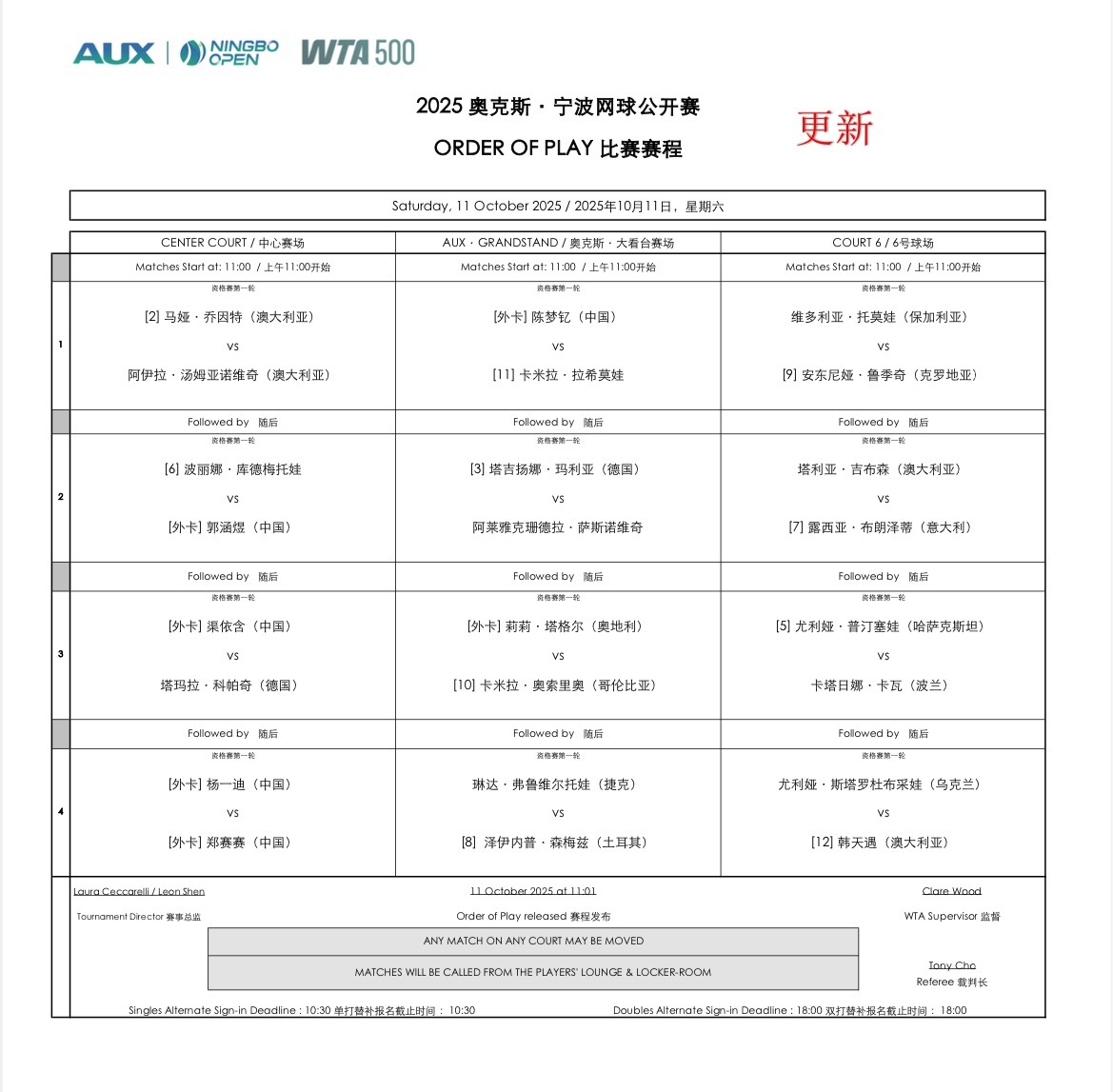 西格蒙德还在武网打女双半决赛,因此退出宁波单打资格赛,中国球员杨一迪持外卡顶替签位,同时资格赛头号种子凯斯勒进入正赛,签位由中国外卡球员渠依含顶替。