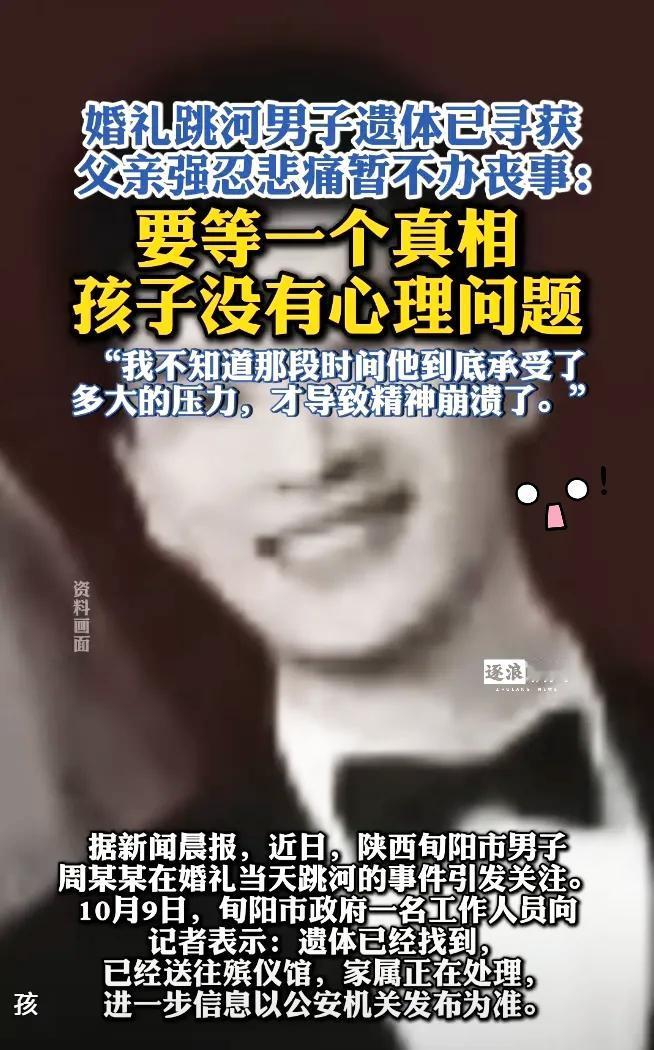旬阳那个新郎的遗体找到了 家属憋着悲痛不办葬礼,非要等个真相,这事看得人心里发沉。 新郎爸爸说孩子没心理问题,就想弄清他到底扛了多大压力。很多人盯着新娘吵没吵架,可我觉得,真正压垮人的或许是那堆“不敢停”的责任。 他自己在西安买房,父母凑了20多万彩礼,连婚事都是拗过父母才成的。 婚礼前就喊累,可没人当回事,直到最后那句“对不起父母”,藏着多少没说出口的崩溃。 所谓的“婚礼琐事”只是导火索,真正的根儿是年轻人被推着走的无奈——退婚怕对不起父母的付出,结婚又扛不住现实的磋磨。 你说,要是他能有“不结婚也没关系”的底气,悲剧会不会不一样?