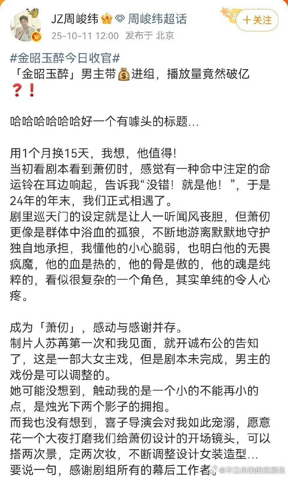 周峻纬长文回应带资进组周峻纬用成绩说话!首次担纲男主剧播放量破亿,这宝藏男孩的