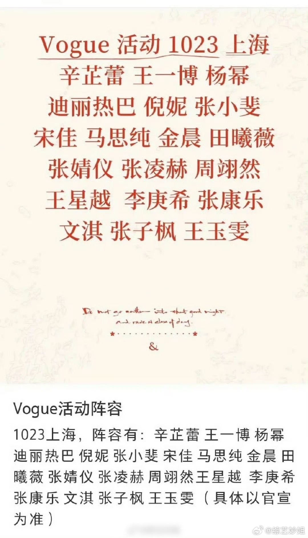 VOGUE23号盛典开始预热!共有52位艺人出席~