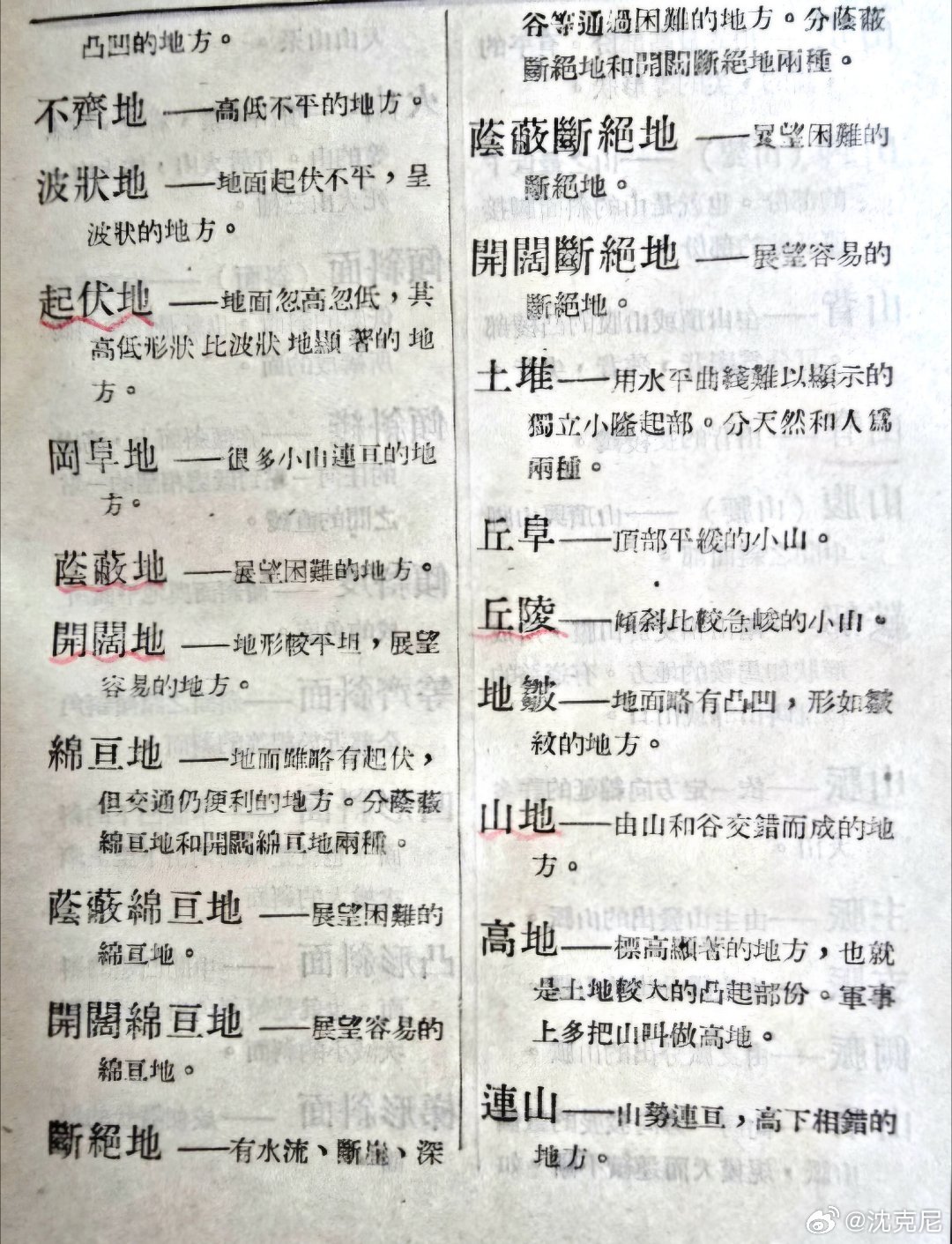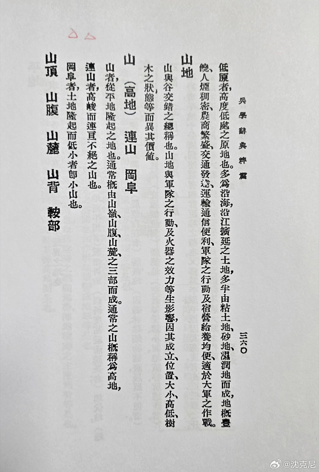 我找到昔日吴石将军著述《兵学词典汇编》,其中词语的释意言简意赅,包括地形学的军语,多为文言文的一句话,然后概要解释。 前不久,我在乔良将军处,见1951年版《军语汇编》一书,其中有不少关于地形学的旧军语,如连山地、冈阜地等,这些词汇是由日本《地形学》中照搬而来的。我对这部释意较完全的《军语汇编》喜不自胜,乔将军看出我的心思,慨然说“拿走便是”!