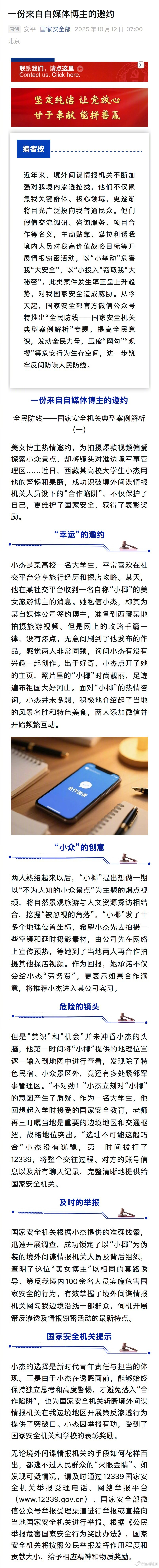 【#美女博主诱导策反我境内100余人#】#大学生识破境外间谍陷阱举报后获表彰# 美女博主热情邀约,为拍摄爆款视频偏爱探索小众景点,却将镜头对准边境军事管理区……近日,西藏某高校大学生小杰用他的警惕和果断,成功识破境外间谍情报机关人员设下的“合作陷阱”,不仅保护了自己,更维护了国家安全,获得了表彰奖励。(国家安全部)