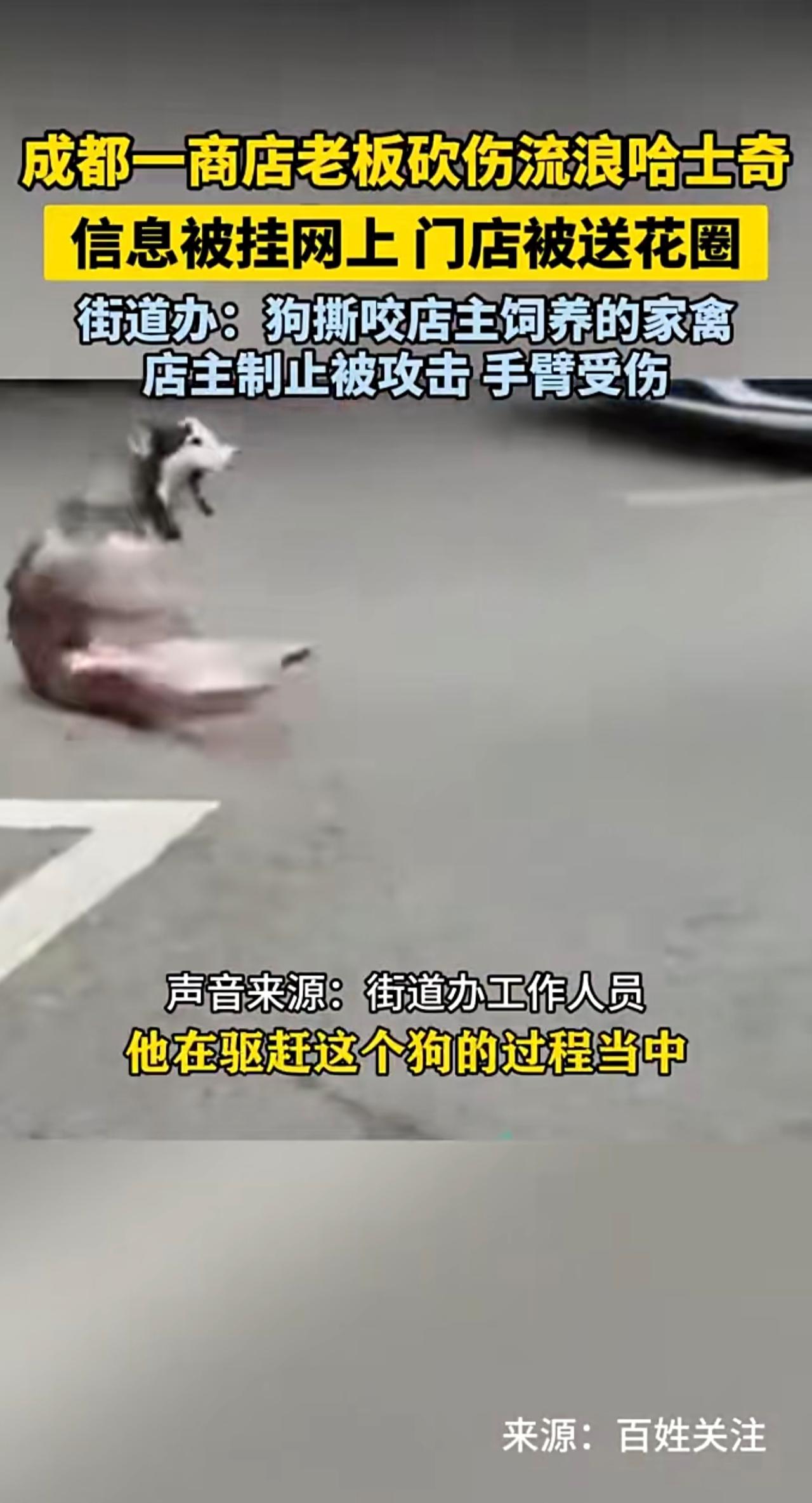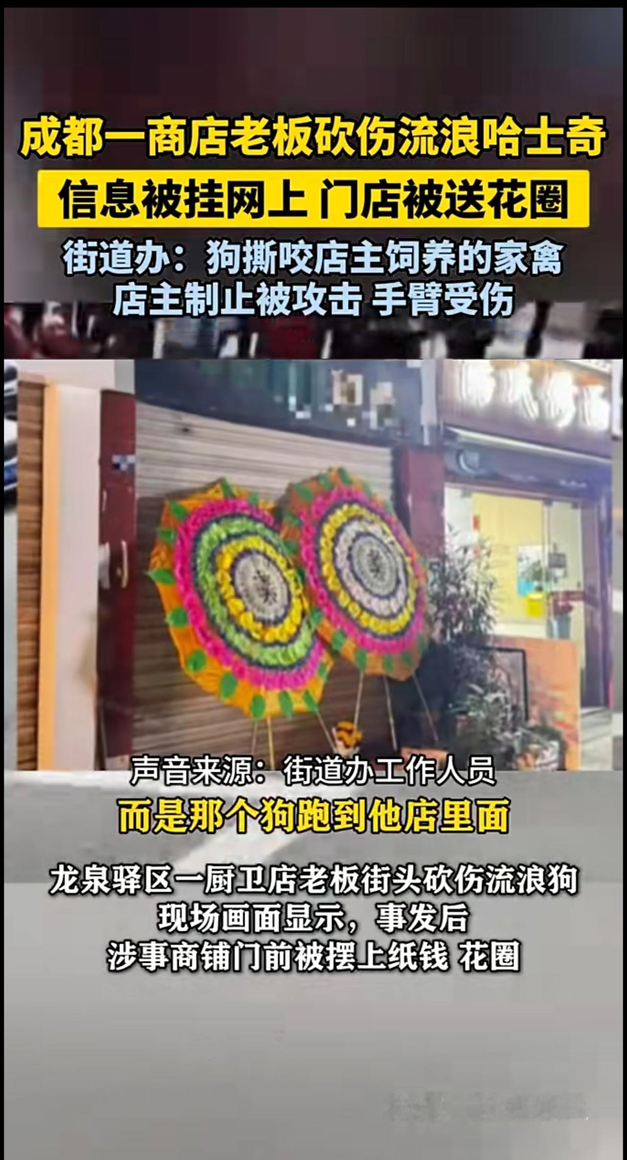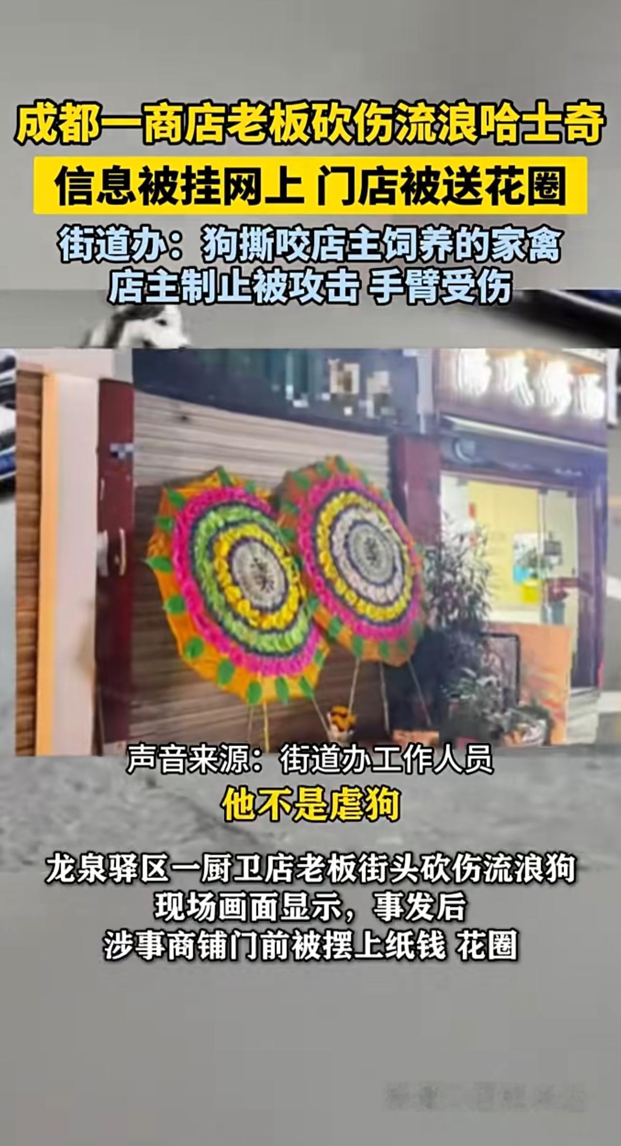 10月11日(采访)四川成都。成都一商店老板砍伤流浪哈士奇,信息被挂网上,门店被送花圈。街道办:狗撕咬店主饲养的家禽,店主制止被攻击,手臂受伤。(来源:百姓关注)