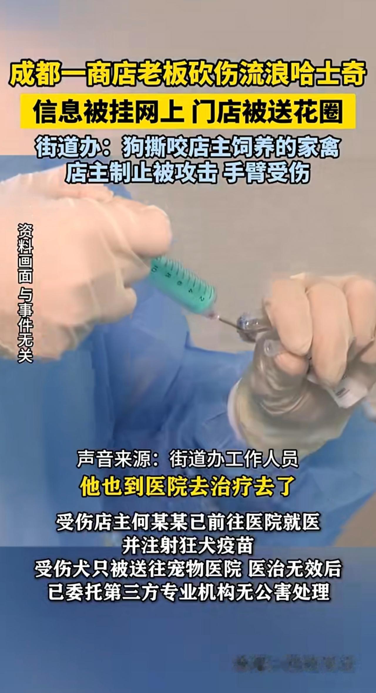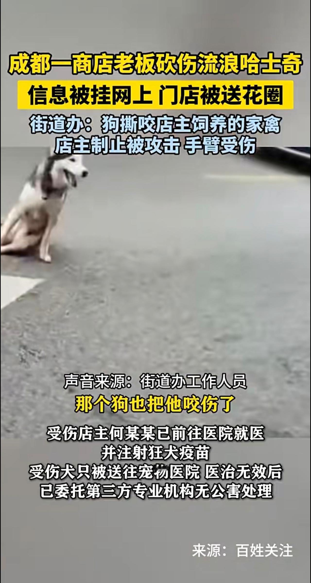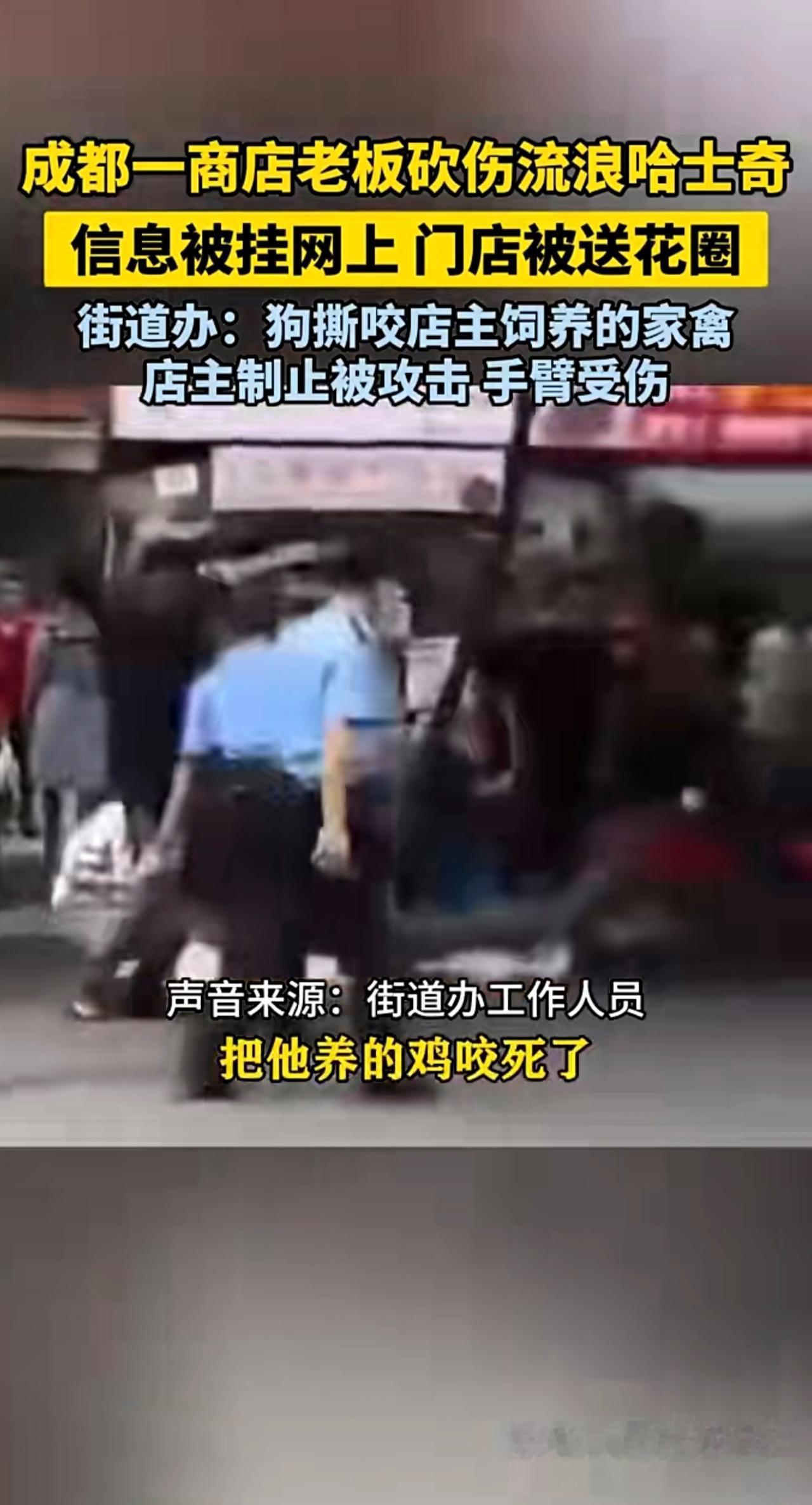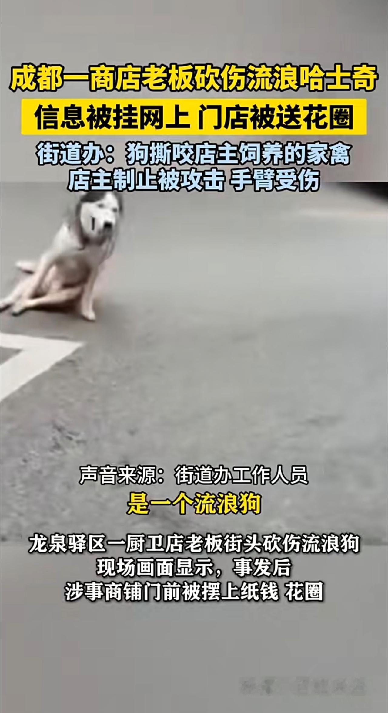 10月11日(采访)四川成都。成都一商店老板砍伤流浪哈士奇,信息被挂网上,门店被送花圈。街道办:狗撕咬店主饲养的家禽,店主制止被攻击,手臂受伤。(来源:百姓关注)