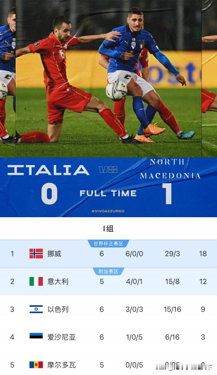 意大利又没了,踢附加赛概率已经接近99.9%了。这个组,强弱分明,榜首之争,率先输球,就赶不回来了。 意大利之前连续踢了两届附加赛,没赢过一次,这次恐怕也是凶多吉少。 意大利现在可以分析各组有可能的小组第二了,12个队伍加欧国联的4个名额,16争4,难度不是一般的大,不确定性因素太多。 要是四星王者意大利连续三届世界杯成为看客的话,那真是天大的笑话。咱国足心里又平衡多了。[捂脸]