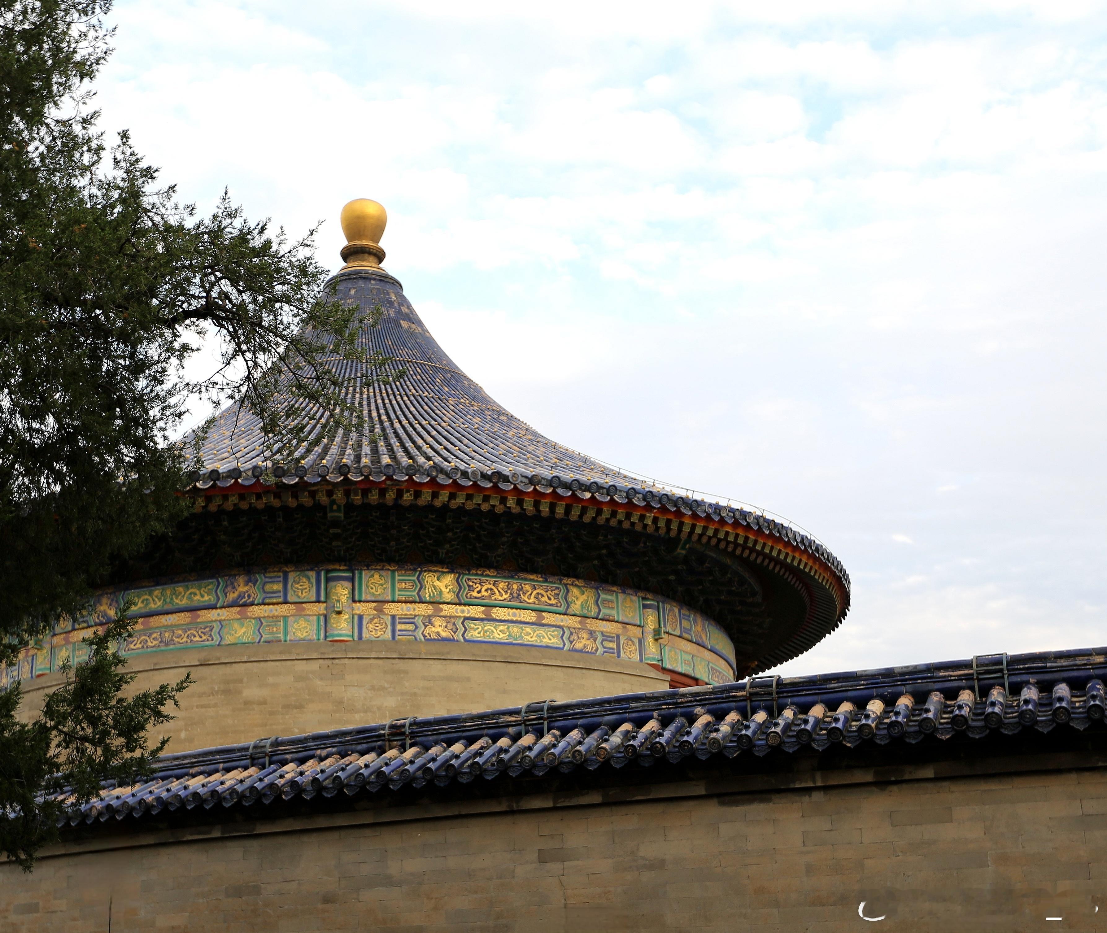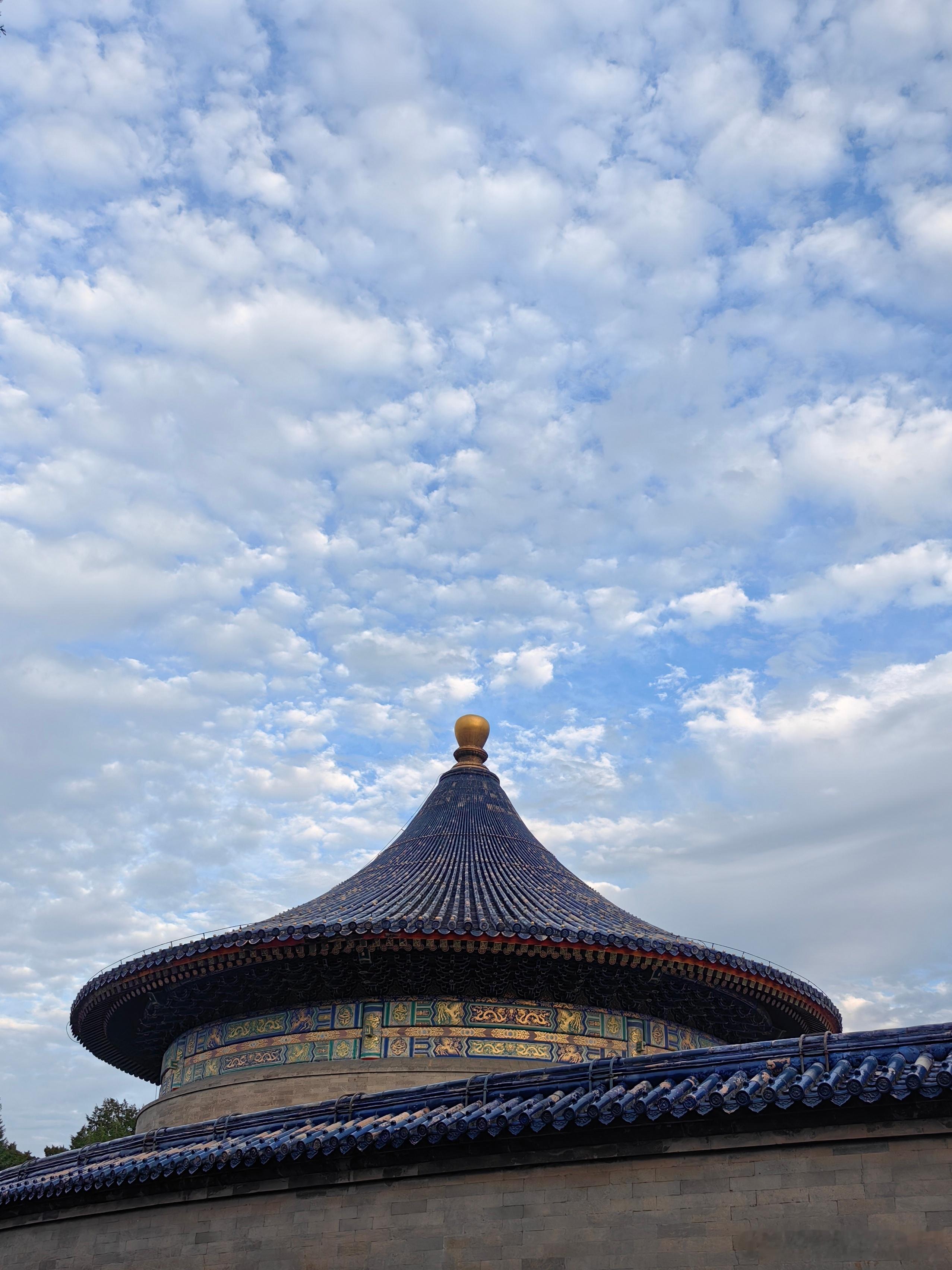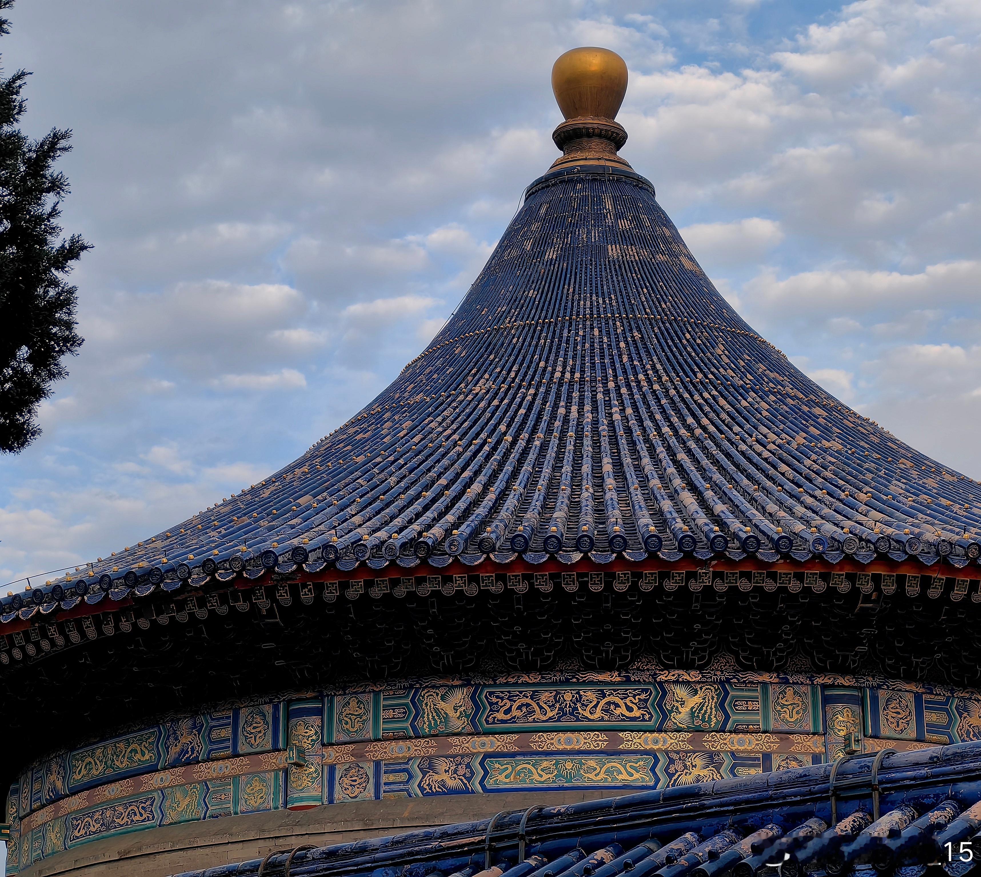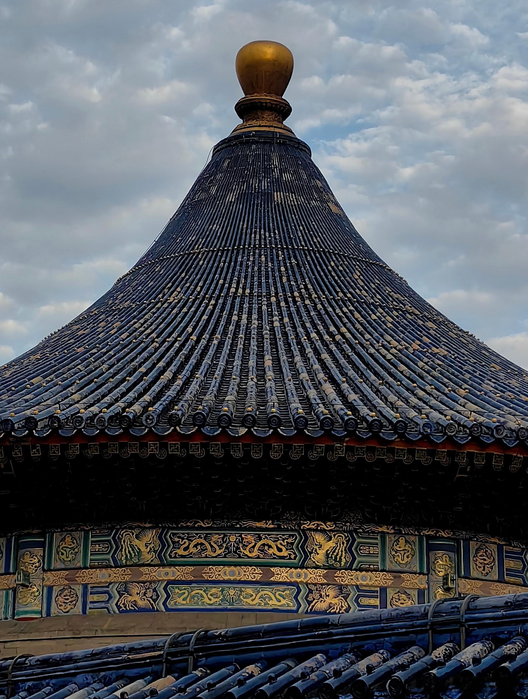 深蓝琉璃瓦攒尖顶如苍穹之冠,鎏金宝顶熠熠生辉,檐下彩绘龙凤纹精美绝伦。从不同角度望去,它或在云絮间更显庄严,或在树影中更具古韵。