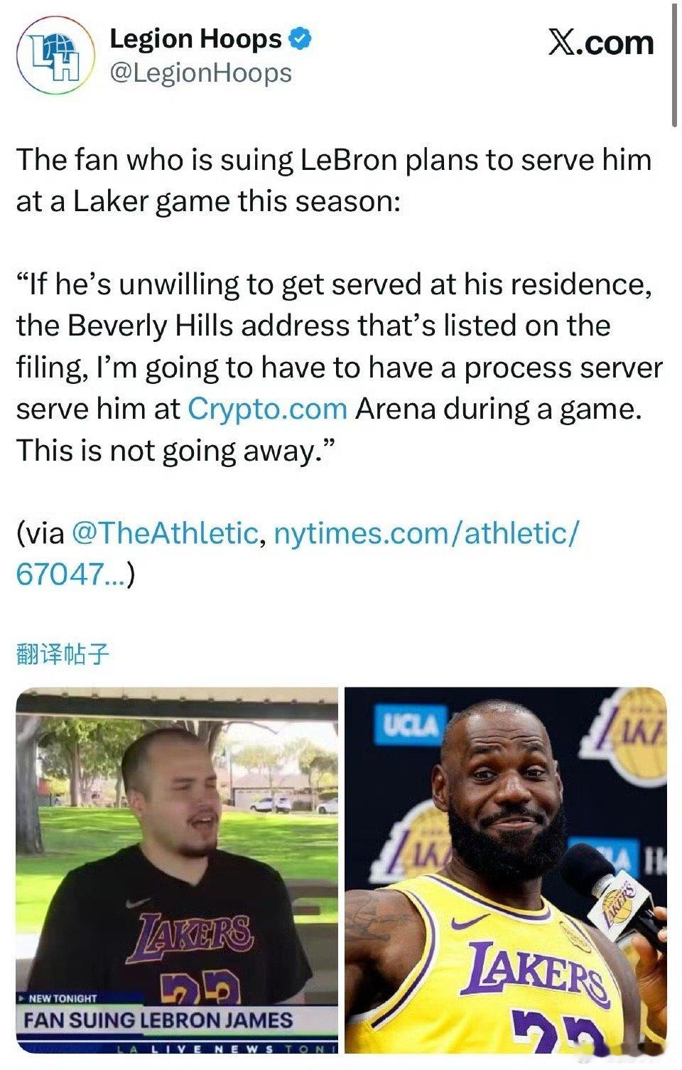 美媒报道,起诉詹姆斯的球迷计划在本赛季队比赛期间向其送达传票:"如果他不愿在其住所接收传票,我将不得不在比赛期间在球馆安排送达人员向他递送传票。这件事不会就此作罢。"