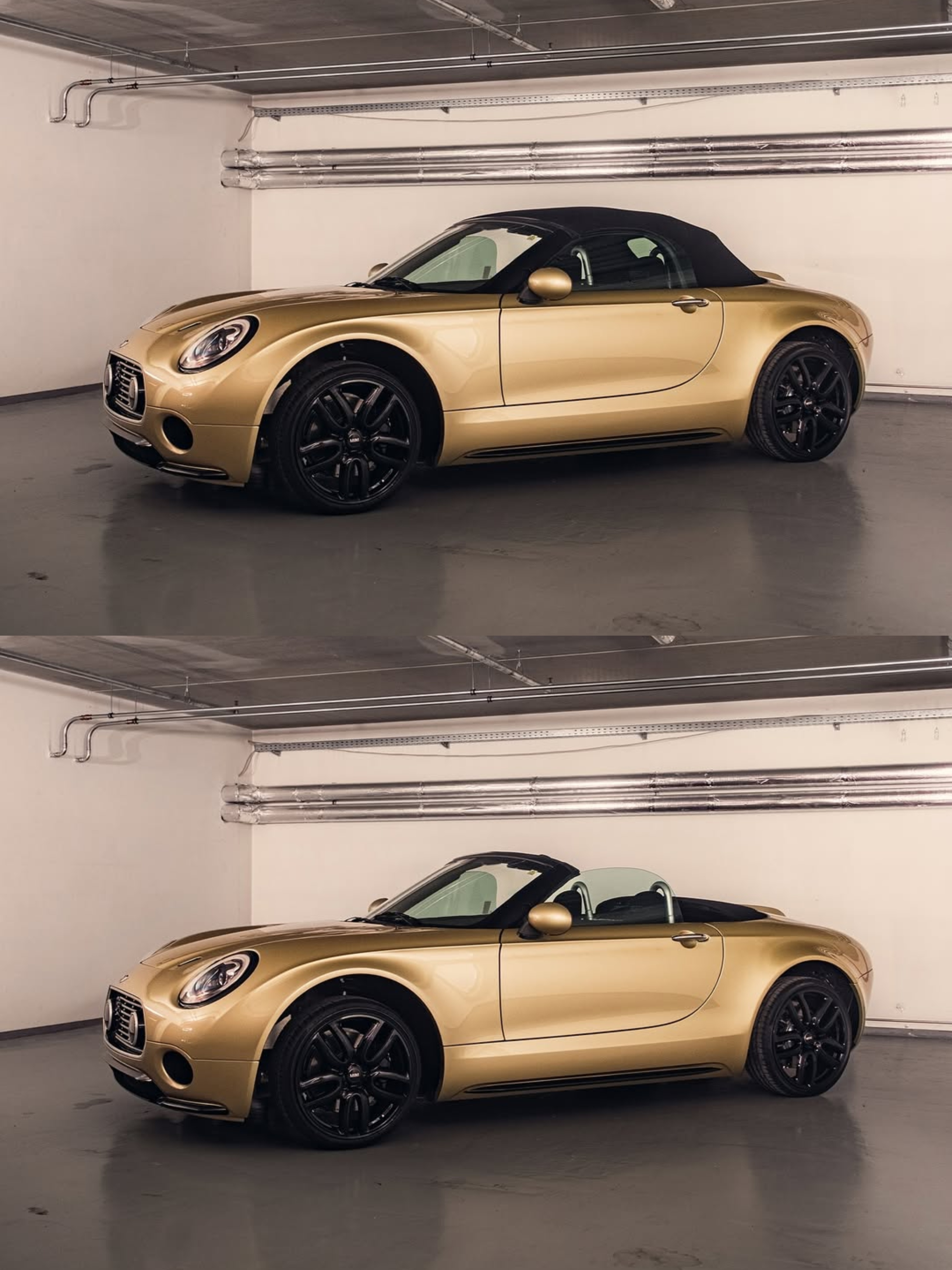 MINI罕见地在ins上发布了当初Superleggera Vision测试车型的软顶开篷过程图片(图5),金色贴膜,JCW轮毂,看着就是量产状态[馋嘴]~