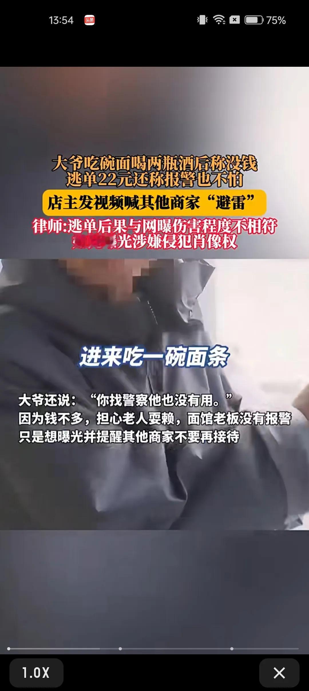 是老人变坏了,还是坏人变老了? 吉林一大爷没钱吃面还喝酒两瓶,声称报警也不怕。店主无奈选择曝光视频希望其他商家避雷。律师称没打码视频侵犯隐私权,称可以联系消协或者报案、法院起诉来维权。 不是店主不想维权,而是金额太小,维权成本太高。22元,却要付上10倍,甚至百倍的金额来承担维权路上的费用,还有无法用金额来计算的时间。到头来获得仅仅只是追回那22元的逃单费,老人依旧潇洒快活,还可以重操旧“业”。 22元对大商家而言或许微不足道,但对普通面馆来说,可能是好几碗面的利润,面对逃单和对方的强硬态度,而网上曝光视频,就店主想到成本最低,效果最好“自保和提醒”的办法。 你说他穷吧,穿着打扮看着也整齐干净 你说他不穷吧,他为了22元逃单,甚至不怕报警。 真是不知道坏人变老了,还是老人变坏? 事件最终的意义已经不是判定谁对谁错,而是让人思考,应该如何维权才能有效又快捷,如何在道德和法律合理的范围约束逃单者,让其受到惩罚。 毕竟只有当“逃单者受约束、维权者有途径”,才能让买卖双方都更有安全感。