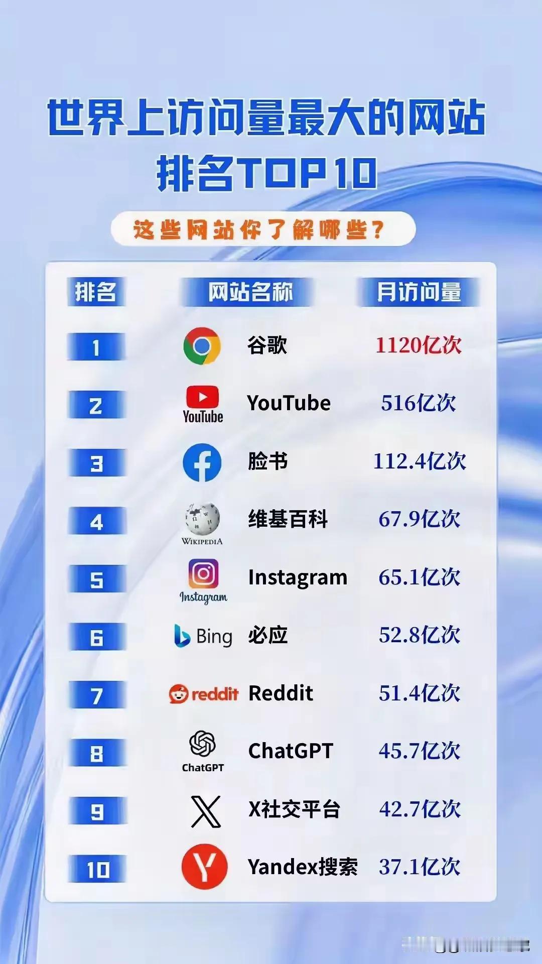 世界上访问量前十的网站,谷歌排在第一,百度没有,腾讯也没有,今日头条也没有。 我觉得今日头条、抖音后期是有机会问鼎前十的,大家拭目以待。 这前十的网站,必应前十年用过,后面都没有用了。谷歌前十几年用过,后面退出中国,也就没有用过了。Yandex搜索倒是用过。 中国网友有十亿左右,网站流量后期还可以后来居上的。