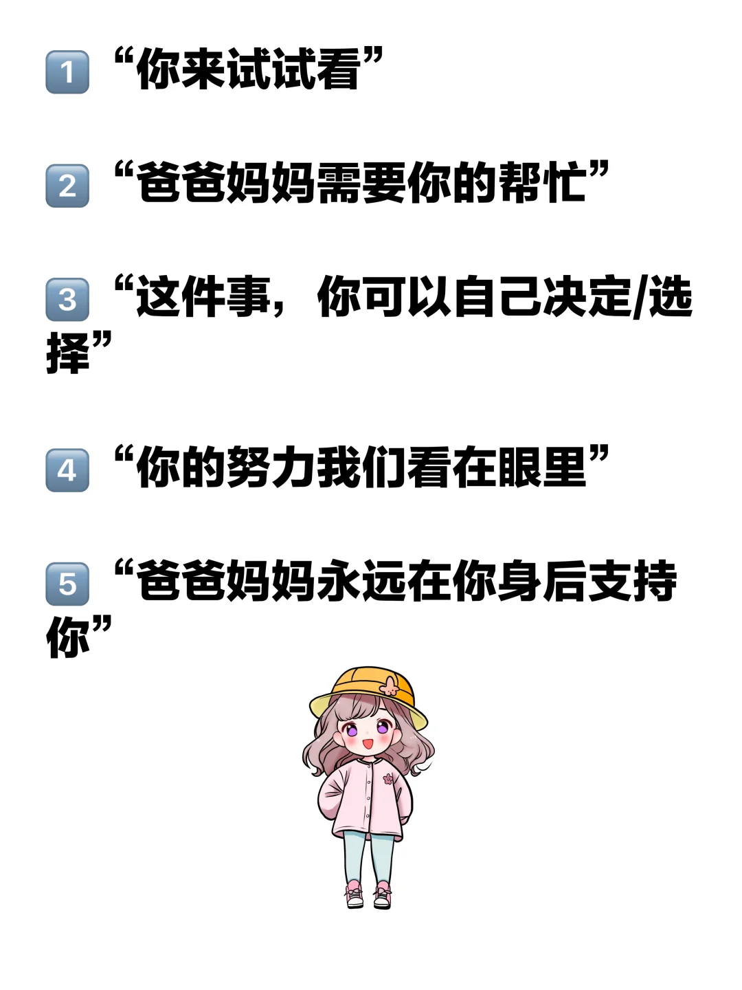 日常生活中的语言,就是最好的起点。我们可以多用下面这样鼓励和信任的表达,悄悄在他们心里种下独立的种子。 1️⃣“你来试试看” 2️⃣“爸爸妈妈需要你的帮忙” 3️⃣“这件事,你可以自己决定/选择” 4️⃣“你的努力我们看在眼里” 5️⃣“爸爸妈妈永远在你身后支持你”
