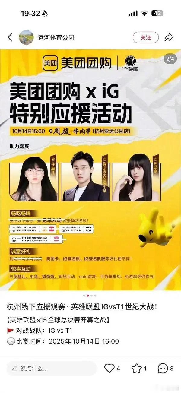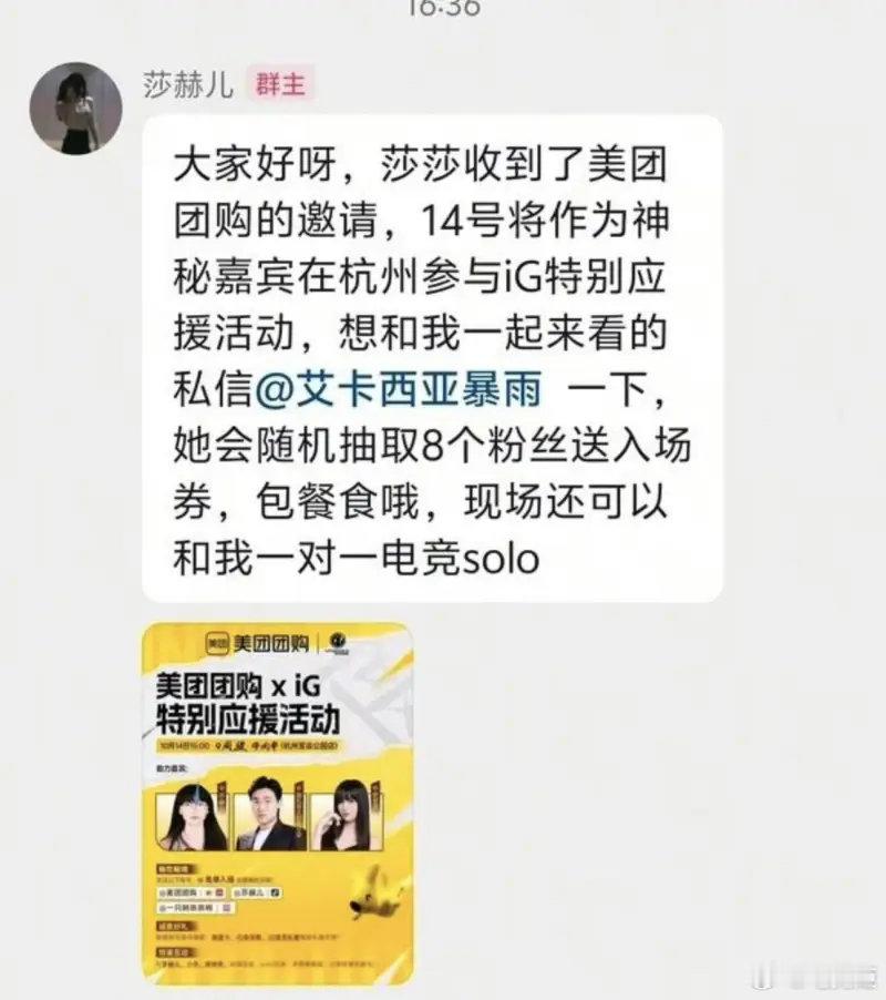 美团和iG举办的应援活动嘉宾邀请了莎赫儿,引发粉丝不满,随后莎赫因工作安排退出美