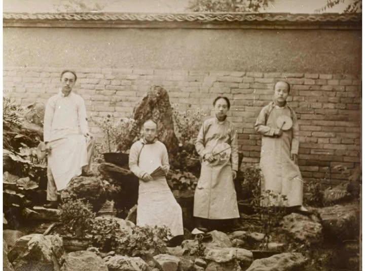 照片里是清末的四位男子,他们身处一处雅致的庭院,周围有山石、绿植点缀,透着大户人家的精致。作为当时的“高富帅”,几人穿着体面的传统服饰。只是看着他们手中拿着的团扇,总觉得有些怪异,在以往的印象里,团扇似乎更常与女性相关,大男人手持团扇,显得颇为特别。