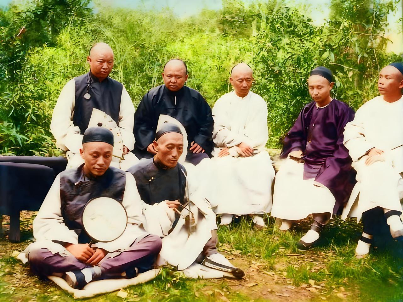 照片里的几位清朝富二代,姿态各异,没有一人盯着镜头。他们身着精致的传统服饰,或坐或站在草木环绕的环境中,神情或淡然或若有所思。也不知道是觉得这样摆姿势够酷,刻意耍帅;还是心里另有想法,有意躲着镜头,总之这副不与镜头“互动”的模样,倒是给这张老照片添了几分别样的味道。