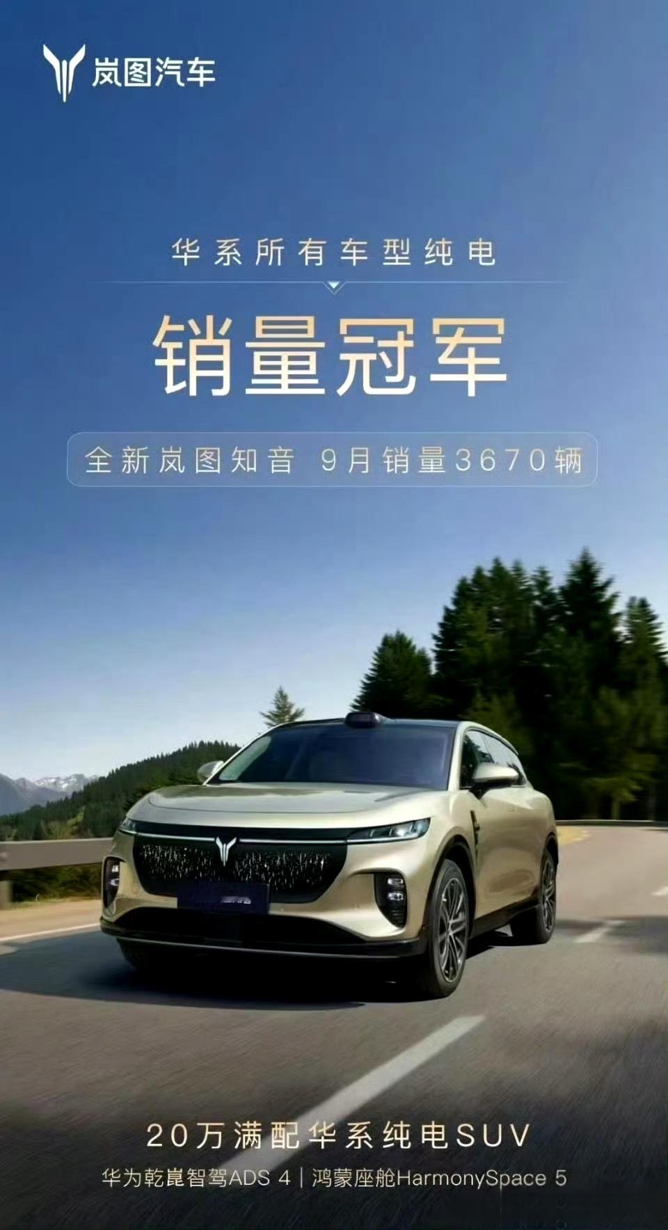 岚图知音,是9月华系纯电SUV里,卖的最好的。 这里应该包括鸿蒙系列的尚界,智界了,岚图知音【来自懂车帝车友圈】