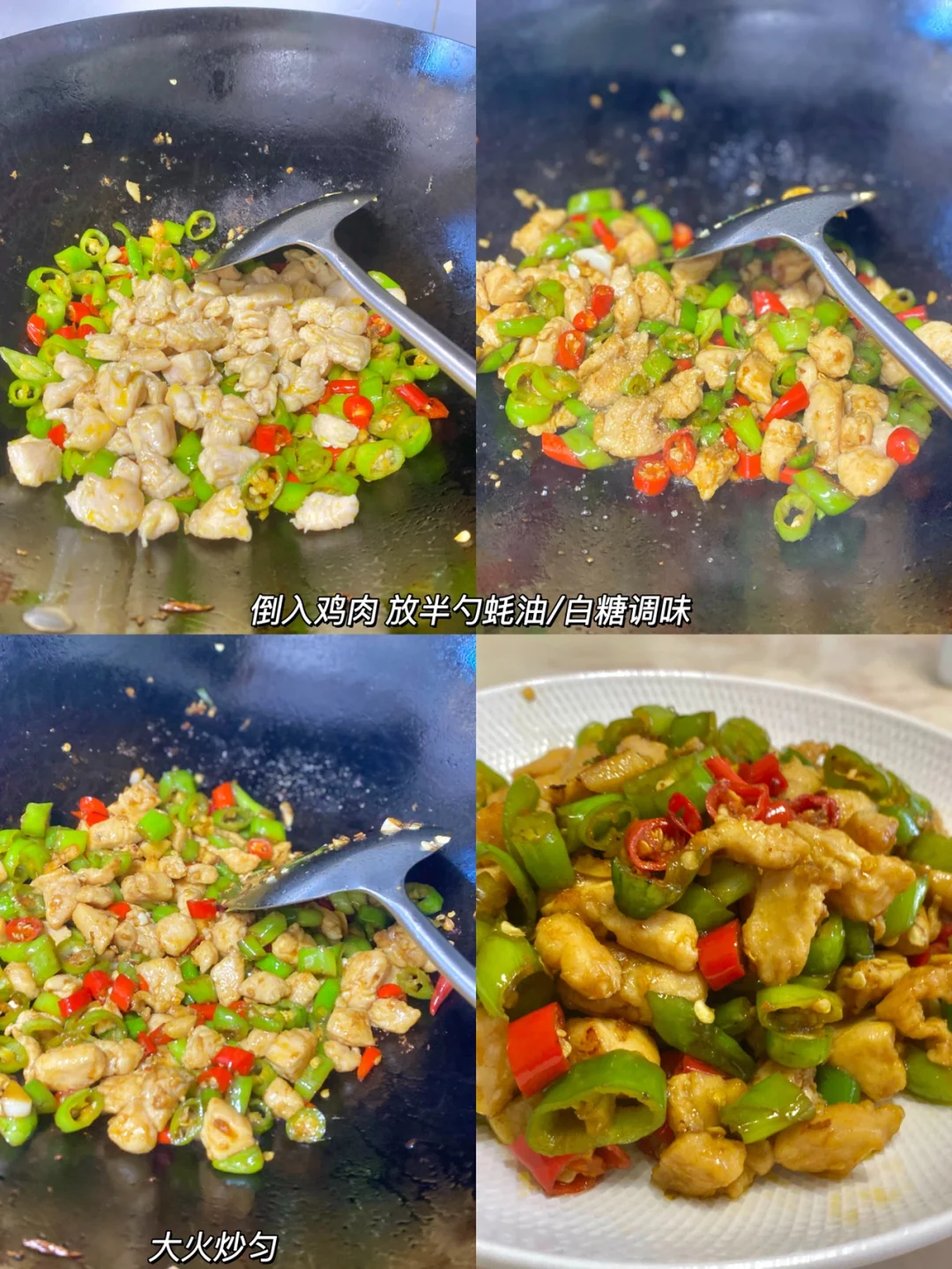 2⃣️:锅烧热倒油 放鸡肉滑到变色盛出,底油炒香蒜末辣椒,把辣味炒出来,加一勺生抽炒均匀,倒鸡肉丁大火炒几下,防半勺蚝油,一丢丢糖大火炒
